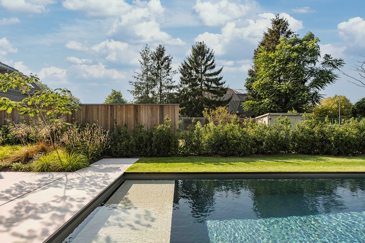 Ce projet allie à merveille design moderne et matériaux naturels. Le profilé de bordure de pelouse épuré s'harmonise parfaitement avec la pierre blanche française chaleureuse, qui s'accorde à son tour parfaitement avec le bois du pool house. La combinaison apaisante des matériaux renforce l'expérience autour de la piscine, où chaque ligne et chaque texture contribuent à créer une atmosphère relaxante.