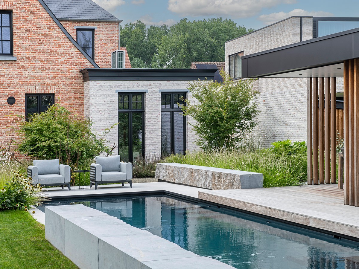 Cette élégante piscine naturelle est le coeur vibrant d'un jardin moderne à Zonhoven. La ligne architecturale de la maison se prolonge harmonieusement dans la conception aquatique, où des matériaux authentiques et robustes s'associent à des accents raffinés et contemporains. La finition en revêtement anthracite, associée à des blocs de pierre bleue, des bordures en calcaire et une terrasse en ipé, offre un équilibre parfait entre robustesse et subtilité. Un design bien pensé où l'architecture, l'eau et la végétation se renforcent mutuellement.