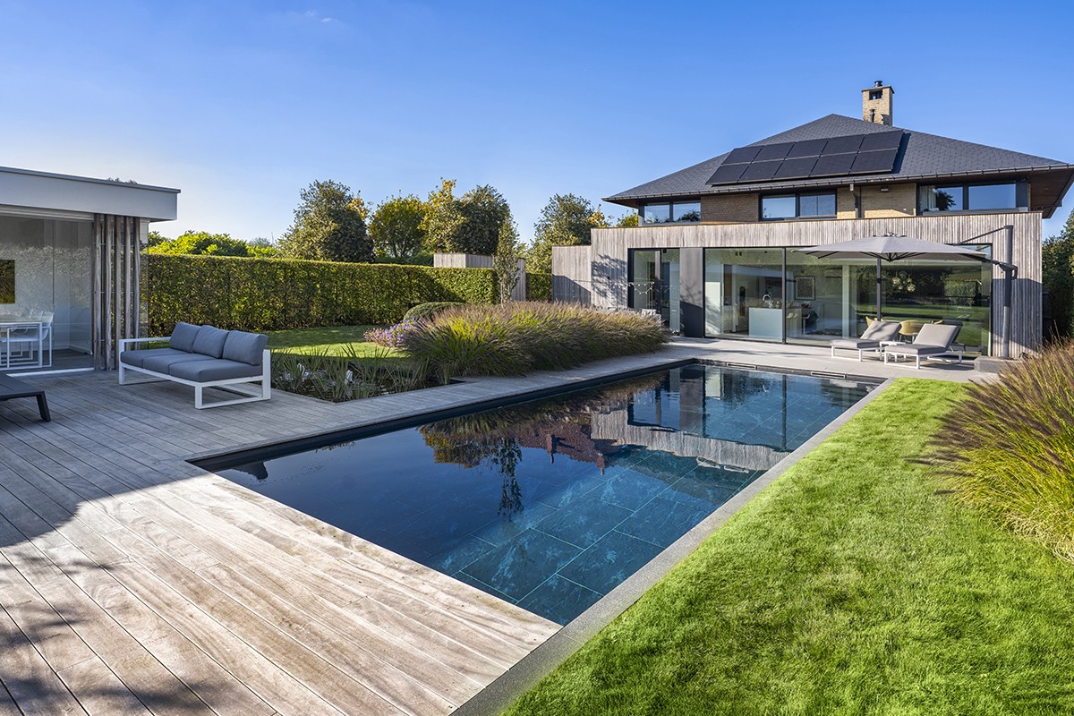 Cet élégant projet, réalisé par Hybrid Pools, associe le charme naturel d'un étang de baignade au confort d'une piscine moderne. Grâce à un système d'hydrolyse innovant, l'eau reste durablement cristalline, sans qu'il soit nécessaire d'utiliser des produits chimiques. Les lignes épurées, la surface de l'eau aux reflets anthracite et les plantations raffinées composées de calamus, potentille et d'iris renforcent l'atmosphère apaisante. Une combinaison parfaite entre technique, esthétique et nature, où luxe et simplicité vont de pair.
