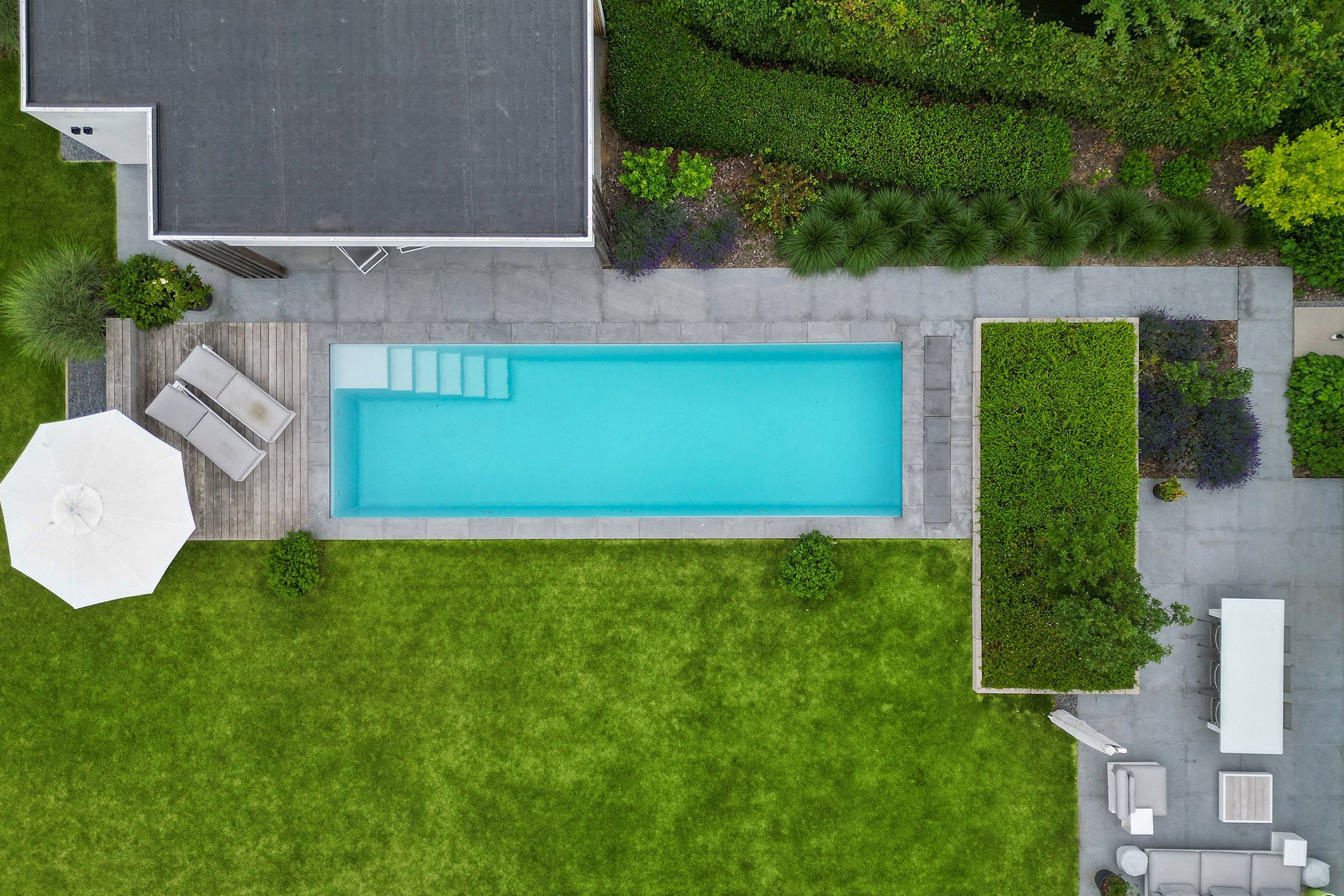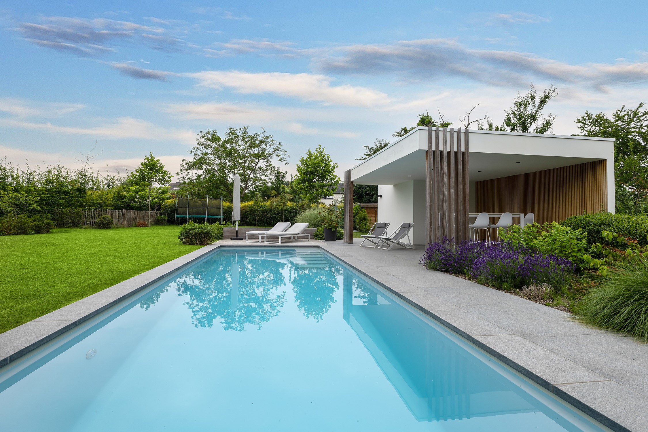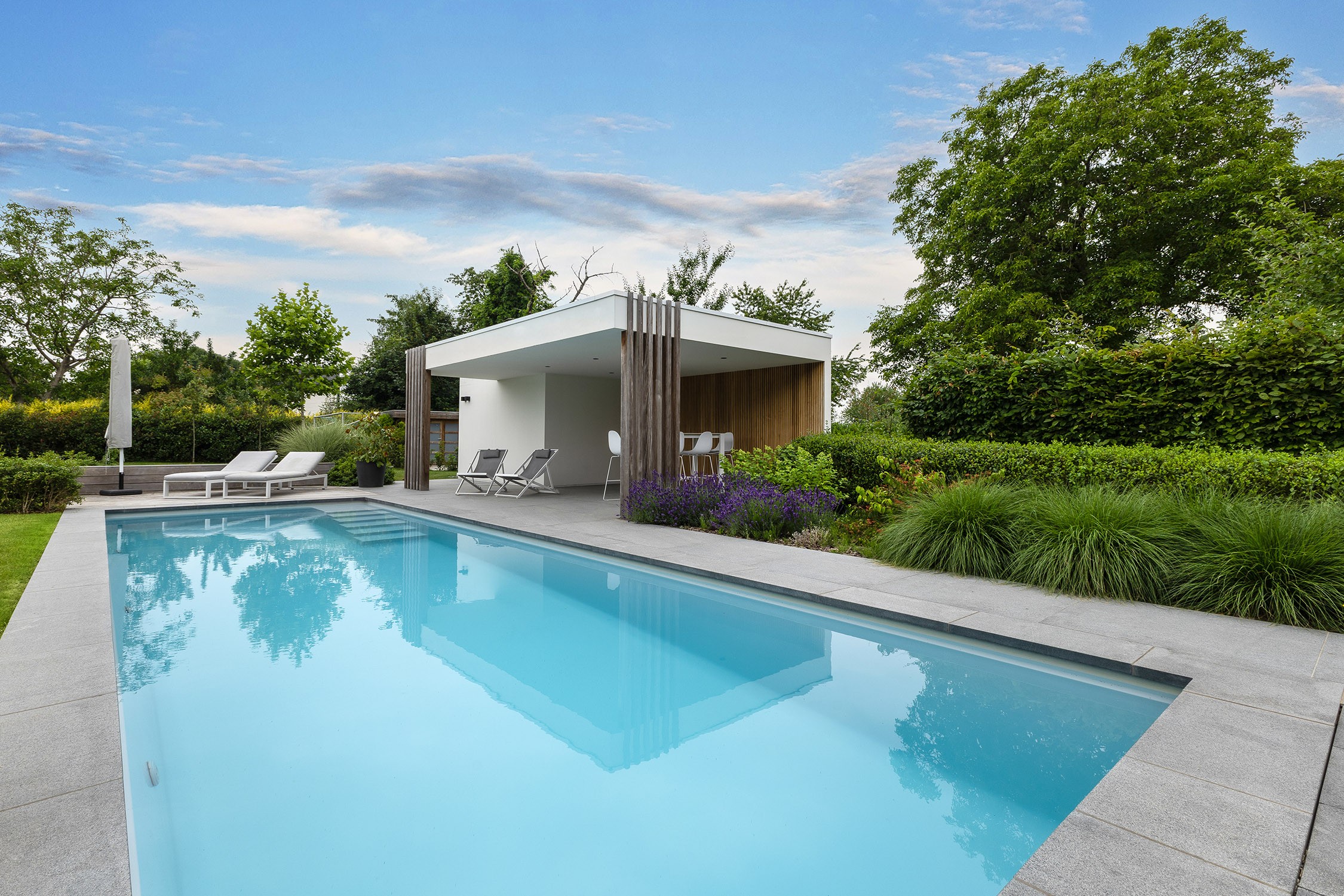 Des carreaux de granit brûlé ont été choisis pour le pourtour de la piscine, contribuant ainsi à l'aspect épuré. Les profilés en L en béton compensent la différence de hauteur dans le jardin, tandis que le pool house, qui comprend un espace de rangement et un salon, permet de profiter du jardin tout au long de l'année. Une bande LED intégrée crée une atmosphère romantique le soir. La terrasse en bois d'ipé, avec ses banquettes assorties, est l'endroit idéal pour prendre un bain de soleil.