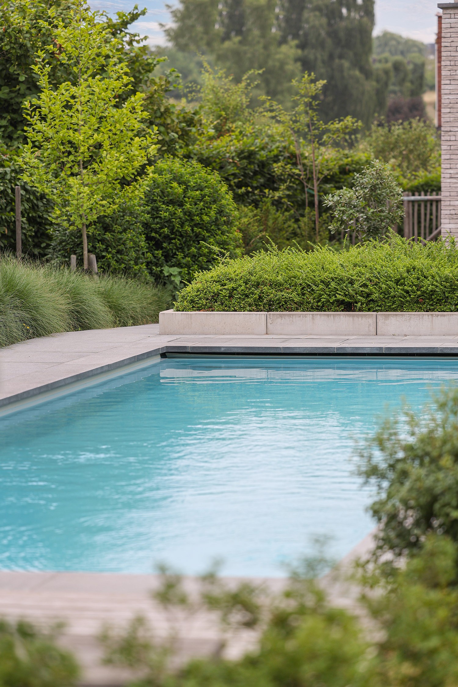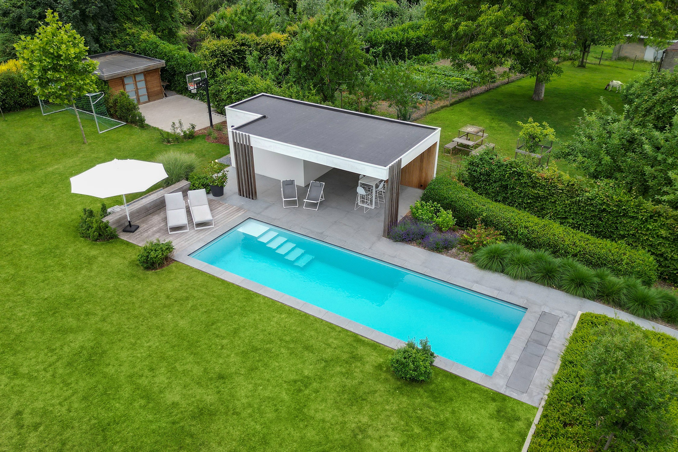 Ce magnifique jardin, doté d’un canal de natation de 12 mètres de long et d’un pool house sur mesure, répond à tous les souhaits des propriétaires. La piscine est un monobloc ZK 12 de LPW avec un volume d'eau de 55 m³, spécialement conçu pour les longueurs. Le système automatisé de traitement de l'eau élimine la nécessité de vérifier manuellement les valeurs de l'eau. La piscine est protégée par un volet isolant. Cerise sur le gâteau, le modèle est équipé de skimmers à ligne d'eau haute qui lui confèrent un aspect contemporain.