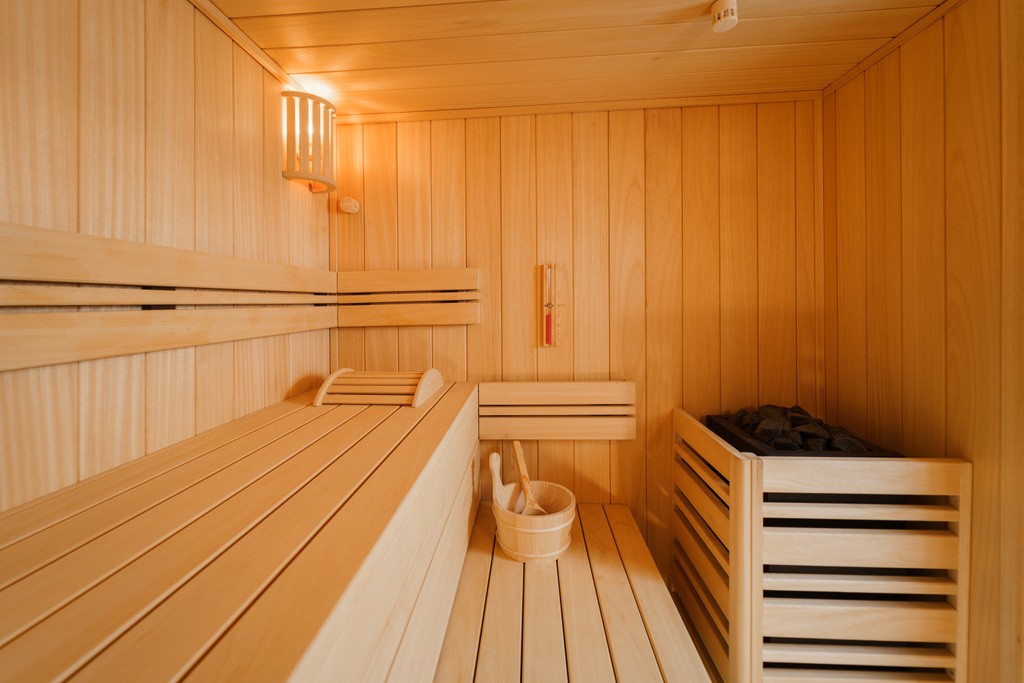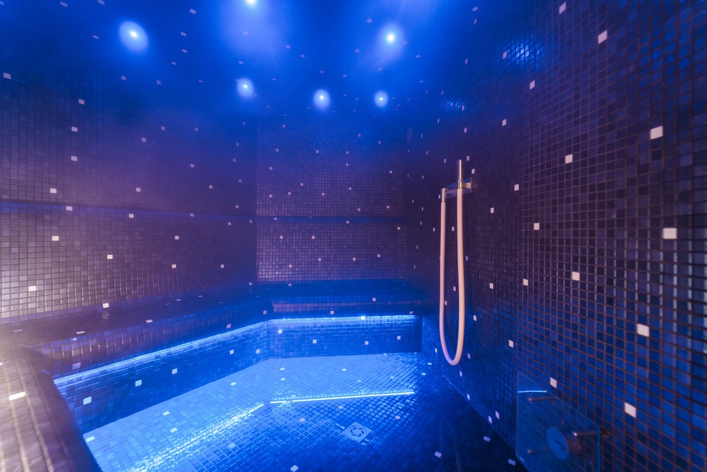 Les saunas sont des modèles classiques et légers, fabriqués en bois d'ayous et équipés de lampes traditionnelles. Les murs, le plafond, les bancs et les dossiers forment un ensemble doux et cohérent, propice à une détente totale. Le boîtier du poêle et les lampes s'harmonisent parfaitement avec ce style. Pour les hammams, Alpha Wellness Sensations a conçu l'espace intérieur avec des bancs moulés et un plafond incurvé, qui ont ensuite été carrelés par un prestataire externe. Des bandes LED ont été intégrées aux bancs et le plafond est équipé de 15 spots. Les portes d'accès aux unités sont en verre de sécurité avec un cadre en aluminium, apportant une touche de modernité à cet espace.