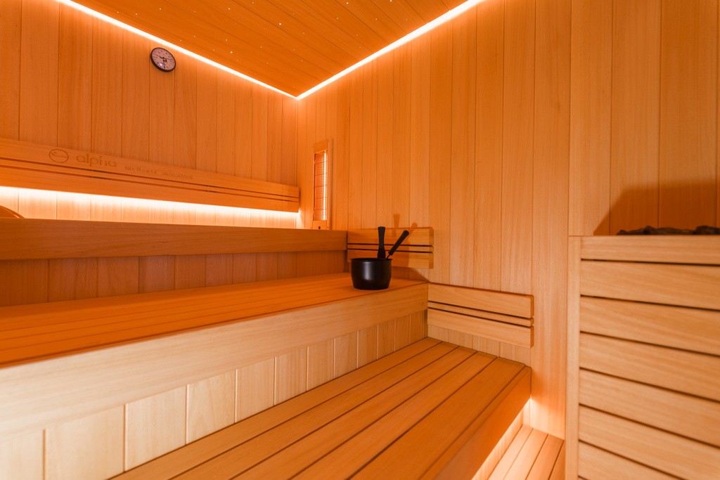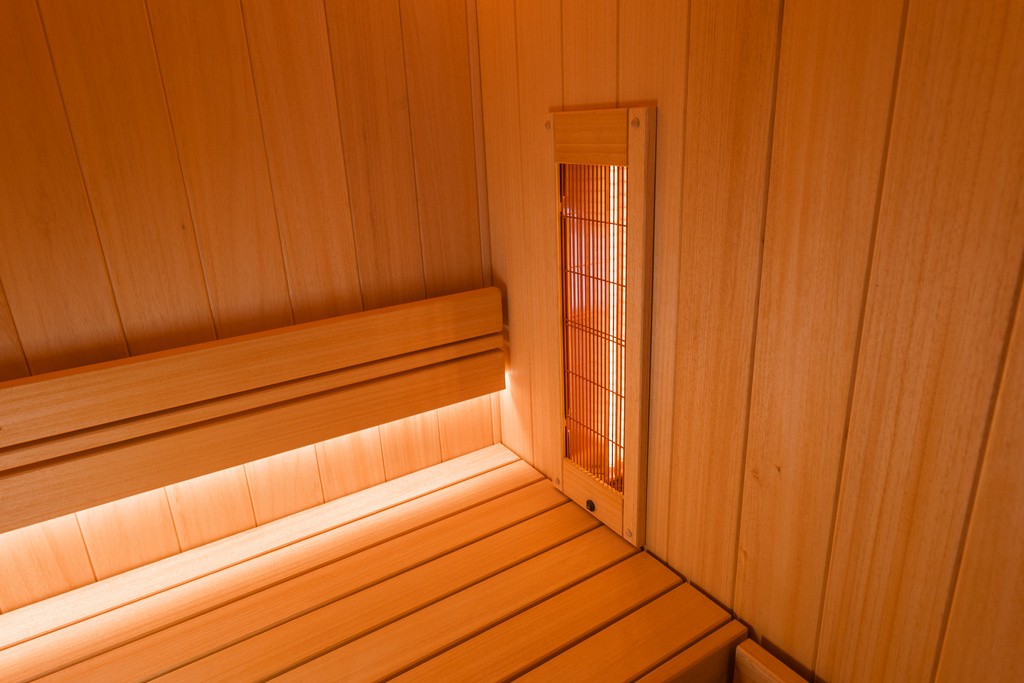 L'éclairage indirect à LED qui encadre le plafond est l'élément clé de ce design. Cet effet est renforcé par un éclairage similaire au-dessus de la banquette supérieure et en dessous de la banquette inférieure. Les trois niveaux de chaleur permettent de choisir la température idéale pour profiter pleinement de sa séance de sauna. Des détails soignés, comme le sablier illuminé par des LED, viennent compléter cette ambiance contemporaine. Pourtant, cette création moderne est tout sauf froide. Le bois d’ayous, aux nuances chaleureuses, confère une sensation agréable,même dans cet univers minimaliste. Les radiateurs infrarouges supplémentaires, installés au-dessus de la banquette supérieure, assurent une montée en température continue pour un confort optimal.