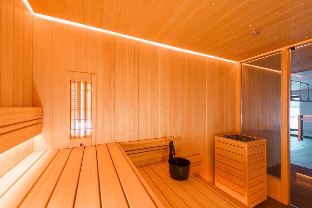 En collaboration avec l'architecte qui a également conçu la résidence du PDG d'AWS, un sauna aux lignes épurées et droites, de style cubiste, a été créé. Dans un mur blanc, une structure en bois invite à pénétrer dans l'univers du sauna. L'antichambre, revêtue de larges planches sur les murs et le plafond, évoque un tunnel dont on atteint la lumière au bout, à travers la paroi vitrée qui dissimule le sauna magnifiquement éclairé.