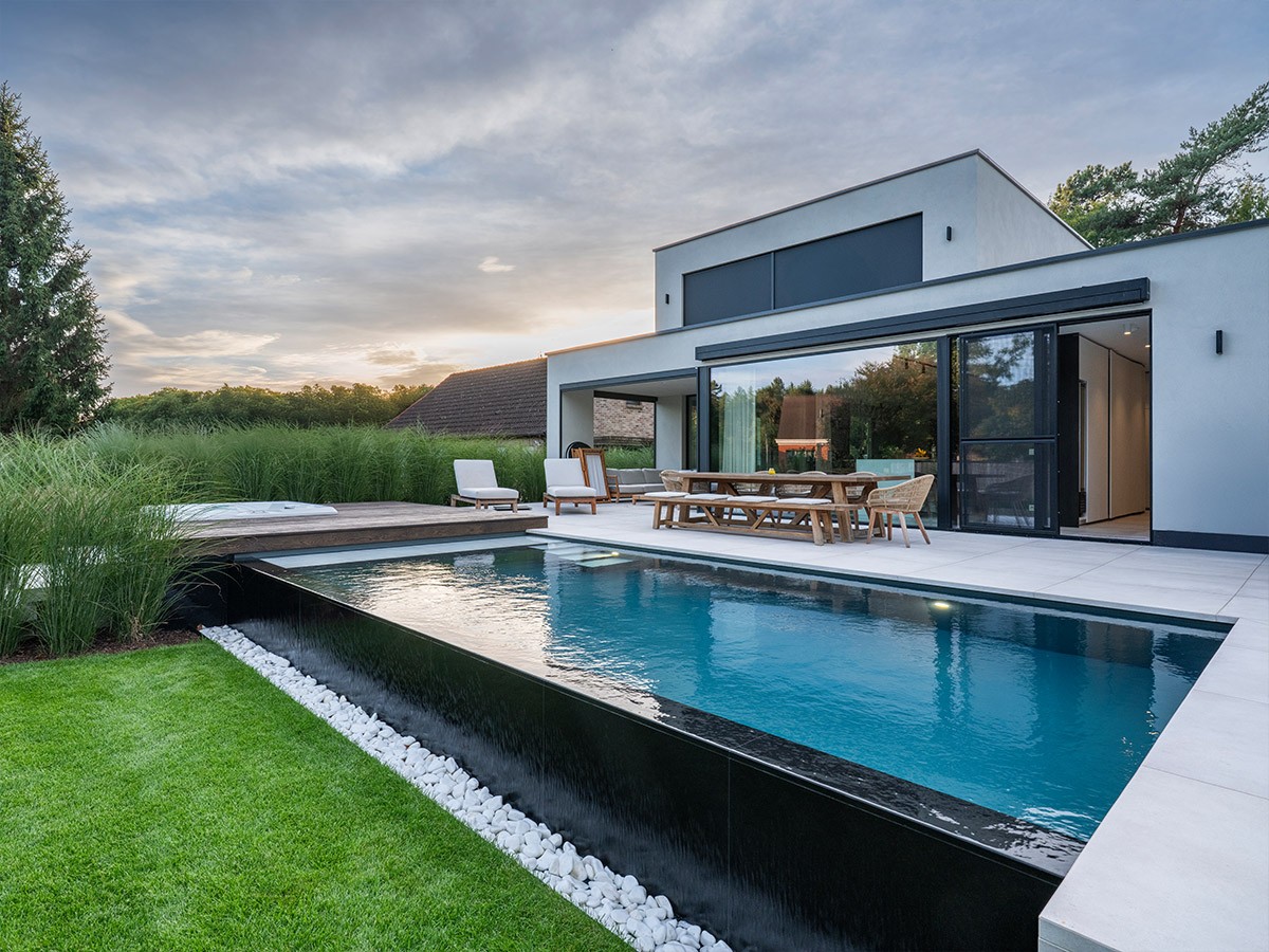 Dans cette maison moderne, la différence de hauteur du jardin a été ingénieusement compensée par une magnifique piscine avec débordement en granit noir. Sur toute la longueur, l'eau s'écoule élégamment par-dessus bord, offrant depuis la maison un effet à débordement saisissant. La finition épurée avec des dalles de terrasse en céramique claire crée un espace extérieur luxueux et serein où l'architecture, l'eau et le paysage se fondent harmonieusement. Le jacuzzi intégré renforce la sensation de confort et complète l'expérience aquatique.