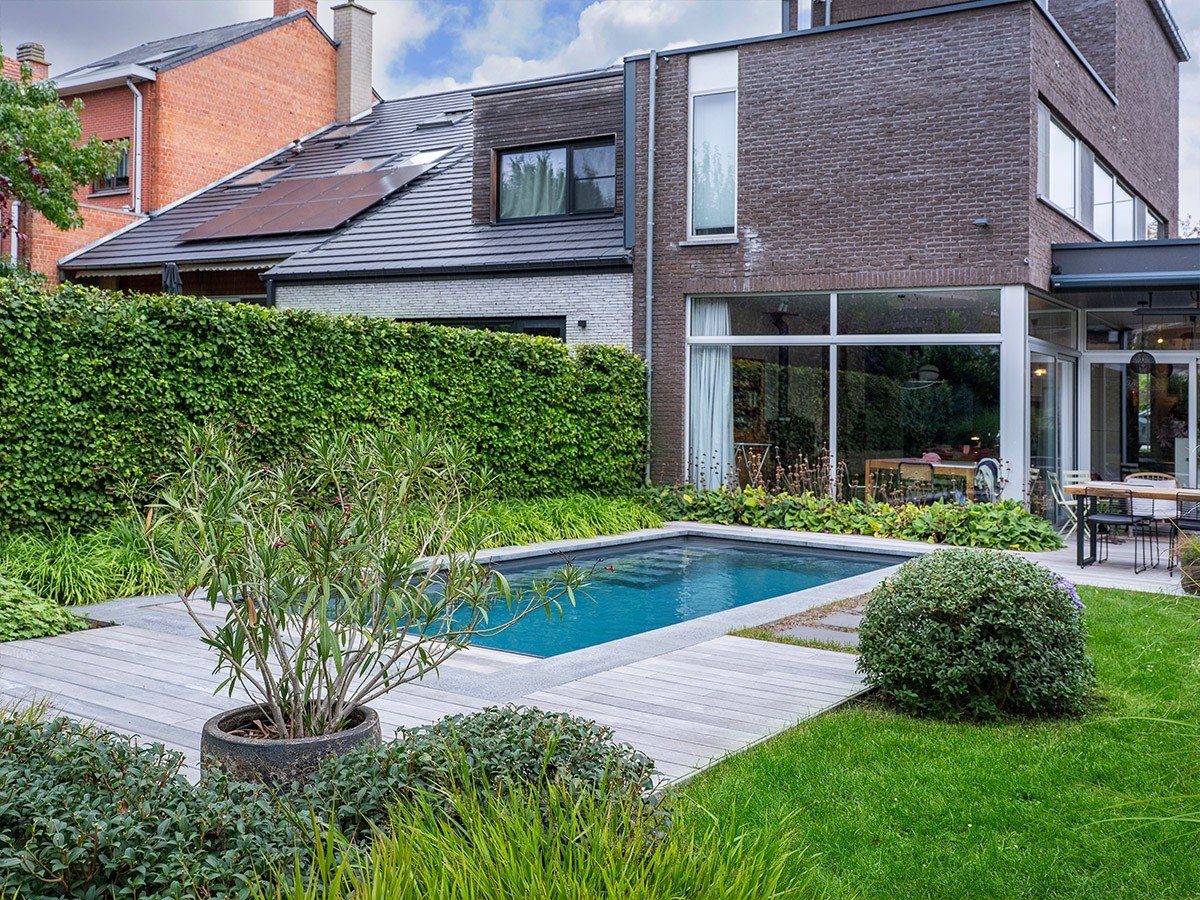 Dans un petit jardin urbain, Tuinwerken Willemsens a créé une oasis de paix où se mêlent eau, végétation et confort. La piscine aux lignes épurées, bordée de dalles en granit, se prolonge dans une bordure végétale foisonnante, riche en couleurs et en textures, qui s'intègre parfaitement à l'environnement. Malgré sa taille compacte, le jardin respire l'espace, la tranquillité et le raffinement. On y perçoit un équilibre subtil entre le luxe contemporain et le charme naturel.