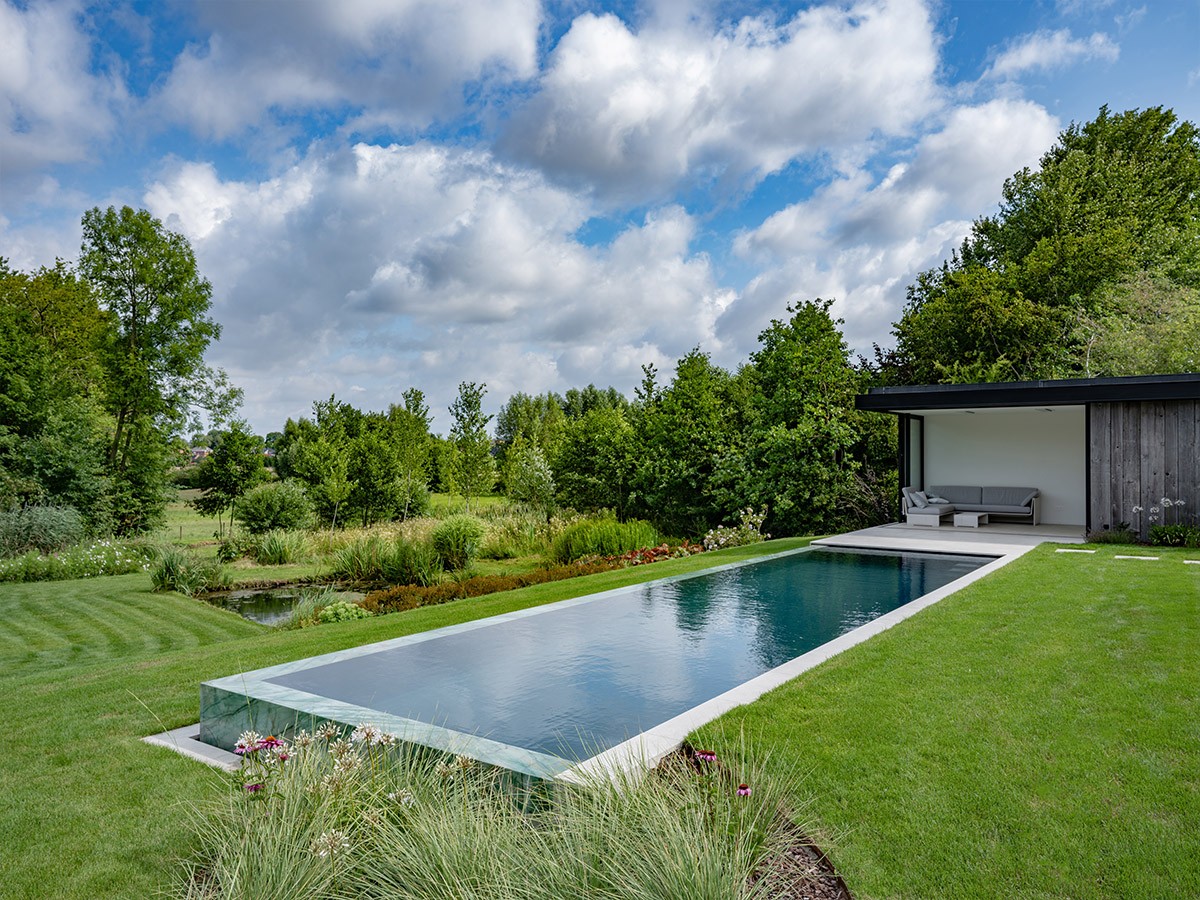À la lisière d'un vaste paysage, Art Pools a réalisé une piscine biologique à débordement qui s'ouvre sur l'environnement et renforce le sentiment de tranquillité. La pierre naturelle verte du rebord et du débordement crée un lien subtil entre l'eau, la pelouse et le pool house. Grâce à la technique d'hydrolyse, l'eau reste claire sans produits chimiques. Les lignes épurées et les douces nuances de vert créent un équilibre parfait entre l'architecture et la nature. Le jardin dégage une atmosphère de sérénité et de raffinement.