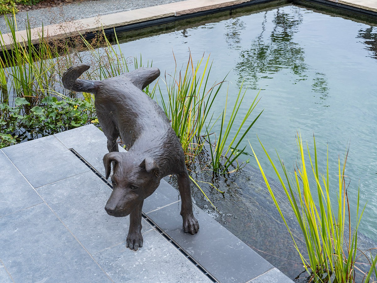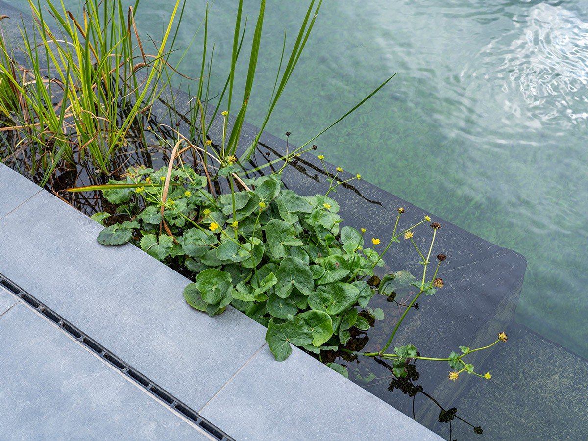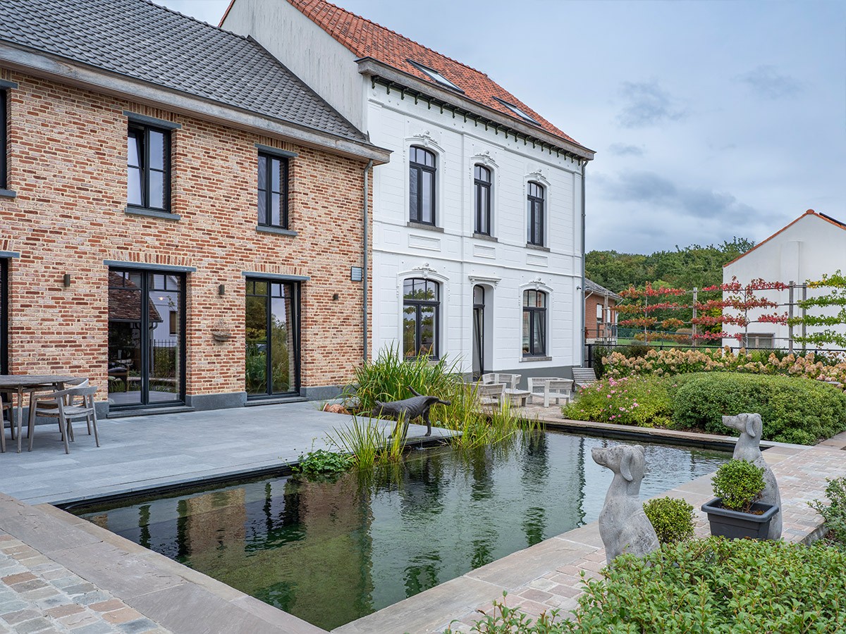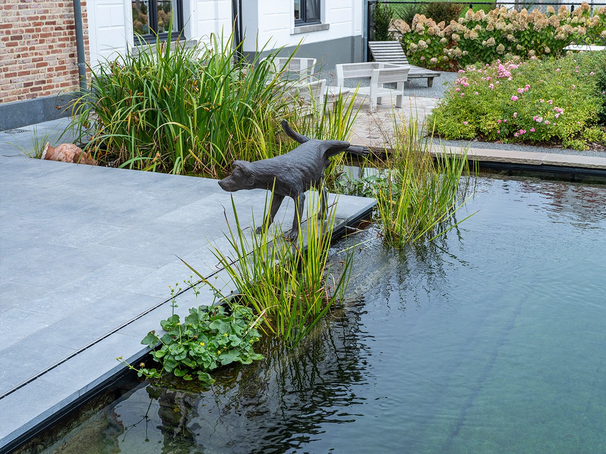 Dans le paysage vallonné de Leefdaal, Tuinwerken Willemsens a réalisé un élégant étang de baignade qui s'harmonise parfaitement avec l'architecture rurale de la maison. Son design épuré contraste subtilement avec l'environnement naturel, tandis que la combinaison de la pierre naturelle Kandla et de la pierre bleue irlandaise lui confère un aspect chaleureux et intemporel. La végétation et la zone marécageuse soigneusement conçue créent un équilibre harmonieux entre nature et design. En bref, un projet de jardin qui respire la tranquillité et le raffinement.