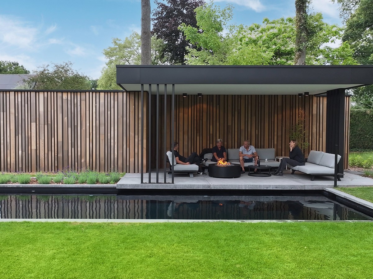 À la lisière d'un jardin boisé avec étang de baignade, Pieter Lens a réalisé un pool house moderne indépendant combinant des matériaux naturels avec des lignes architecturales épurées. Le revêtement de façade en bois de cèdre, composé de lames aux largeurs variables et de profilés en aluminium noir en retrait, crée une composition rythmée en parfaite harmonie avec son environnement. L'espace salon ouvert est couvert et équipé d'une cheminée à gaz, ce qui permet de l'utiliser en toutes saisons. L'annexe dégage une atmosphère chaleureuse et accueillante. Une combinaison réussie de bois, d'aluminium et de confort moderne.