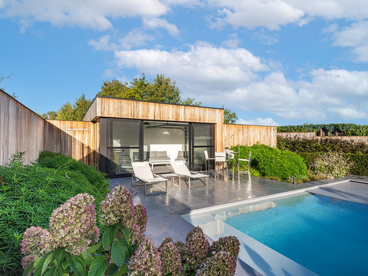 Ce pool house, à Scherpenheuvel, a été conçu comme un espace polyvalent, à la fois esthétique et fonctionnel. En été, il se transforme en salon et espace de réception au bord de la piscine, tandis qu'en hiver, il devient un espace d'exposition pour une voiture de collection. La façade en padouk et les baies vitrées coulissantes en aluminium permettent de fermer complètement la structure, sans pour autant sacrifier son ouverture sur l'extérieur. Le sol en céramique se prolonge harmonieusement de l'intérieur jusqu'au bord de la piscine, accentuant ainsi la sensation d'espace. Cette piscine a également remporté l'or dans la catégorie « Monobloc standard moins de 60 000 € » et est visible page 17.