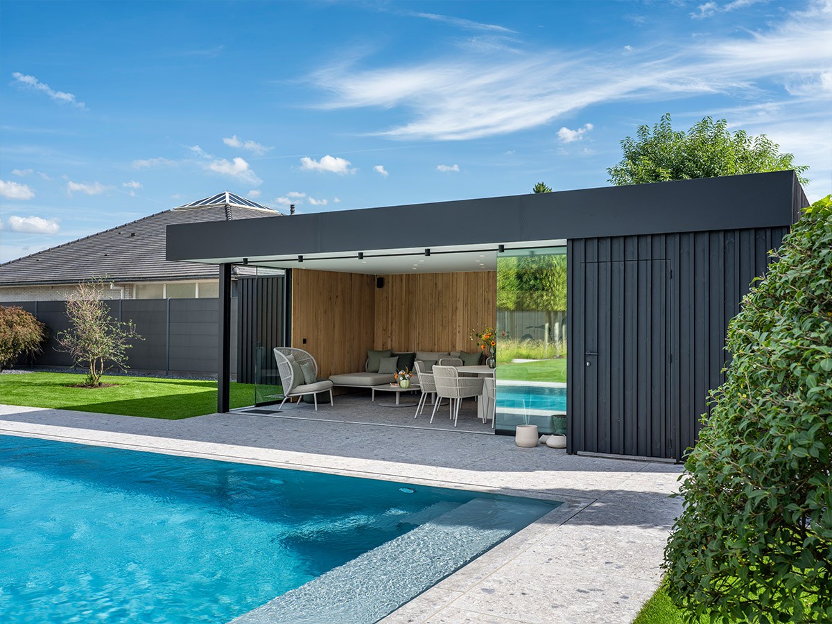 Ce pool house moderne, construit par Tuinen Paul Nijst à Lanaken, affiche une allure chic et contemporaine. Les matériaux naturels s’allient aux technologies modernes pour former un ensemble magnifique. Le sol en céramique Ceppo di Gres se prolonge sans transition de la terrasse vers l'intérieur, où le revêtement mural en chêne et le bois thermique noir apportent chaleur et caractère. De larges baies vitrées coulissantes disparaissent complètement dans les rails intégrés au sol ouvrant l'espace sur la piscine. À l'intérieur, un bar intégré avec mobilier sur mesure, système audio Sonos et chauffage Aircover garantissent un confort maximal. À l'extérieur, une douche JEE-O encastrée vient parfaire l'ensemble.