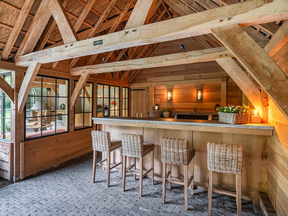 Ce charmant pool house à Destelbergen constitue une harmonieuse extension de la maison. Le toit de chaume, la structure en chêne et les fenêtres en fer forgé lui confèrent un aspect chaleureux et rustique. À l'intérieur, le pavage de briques d'argile posées en chevrons et l'accueillante cheminée invitent à la détente. La grande terrasse couverte avec bar et cuisine extérieure est le coeur battant de la vie en plein air. Grâce au vestiaire, à la douche et aux rangements, il s'agit d'un concept global bien pensé qui allie à la perfection authenticité, confort et fonctionnalité.