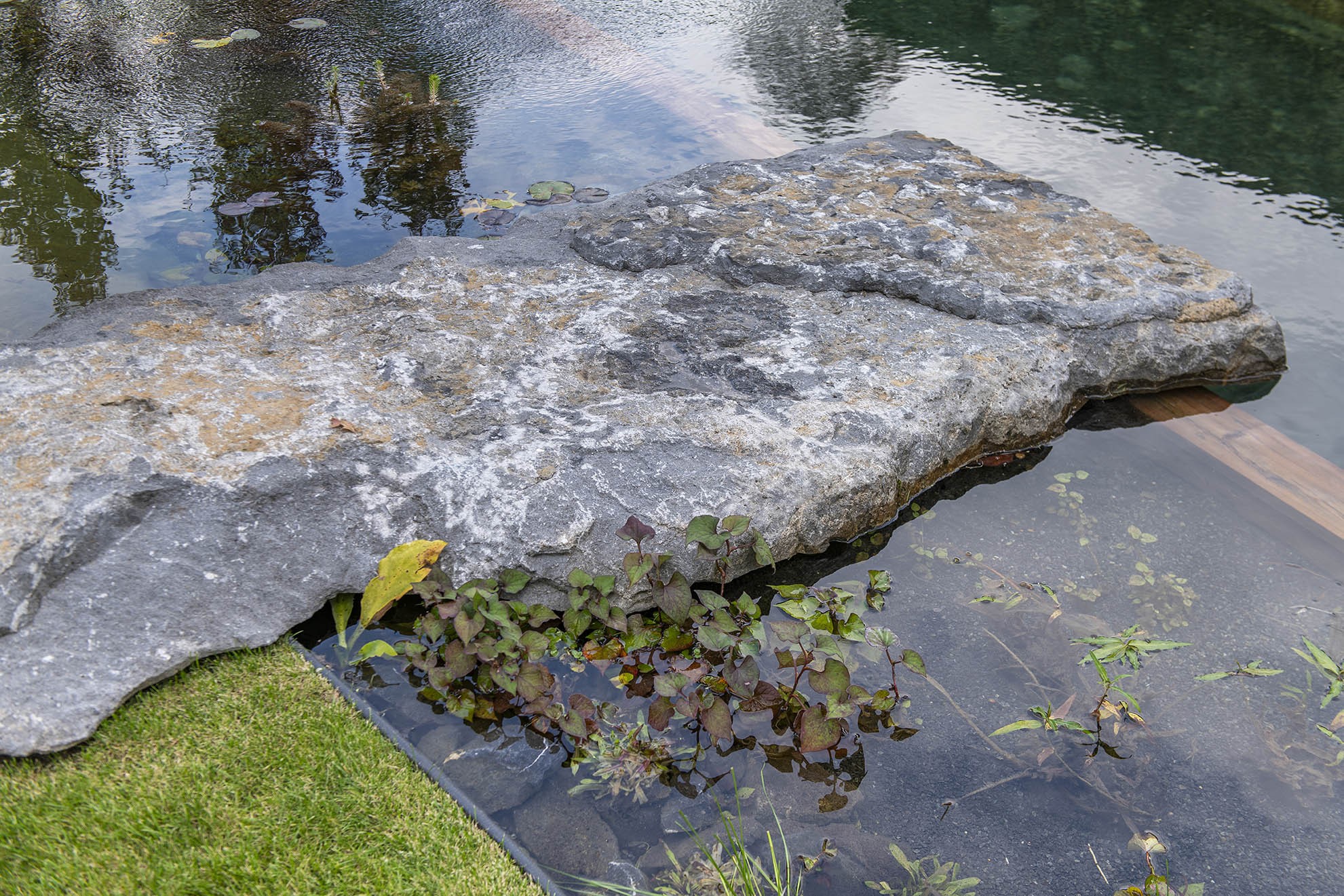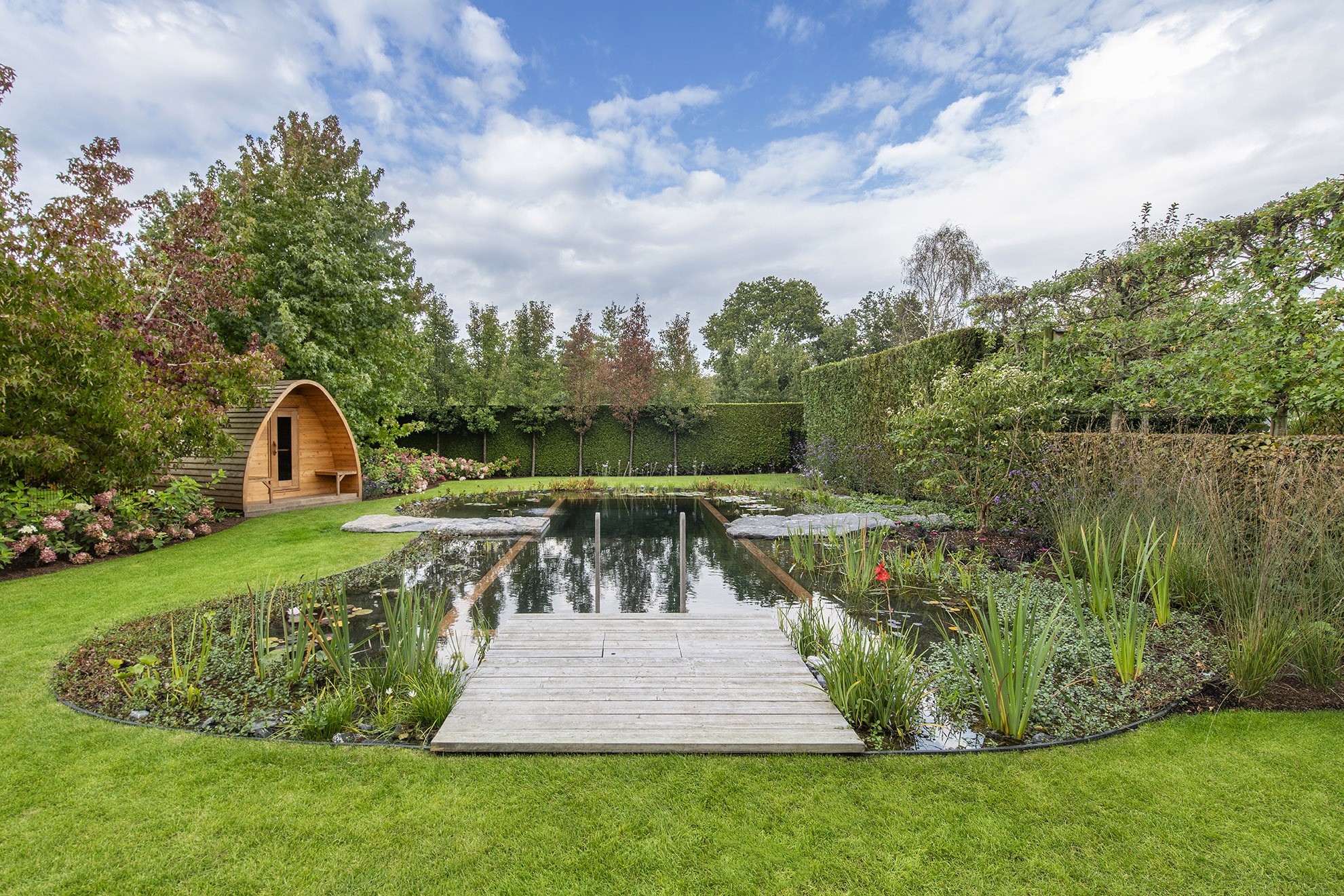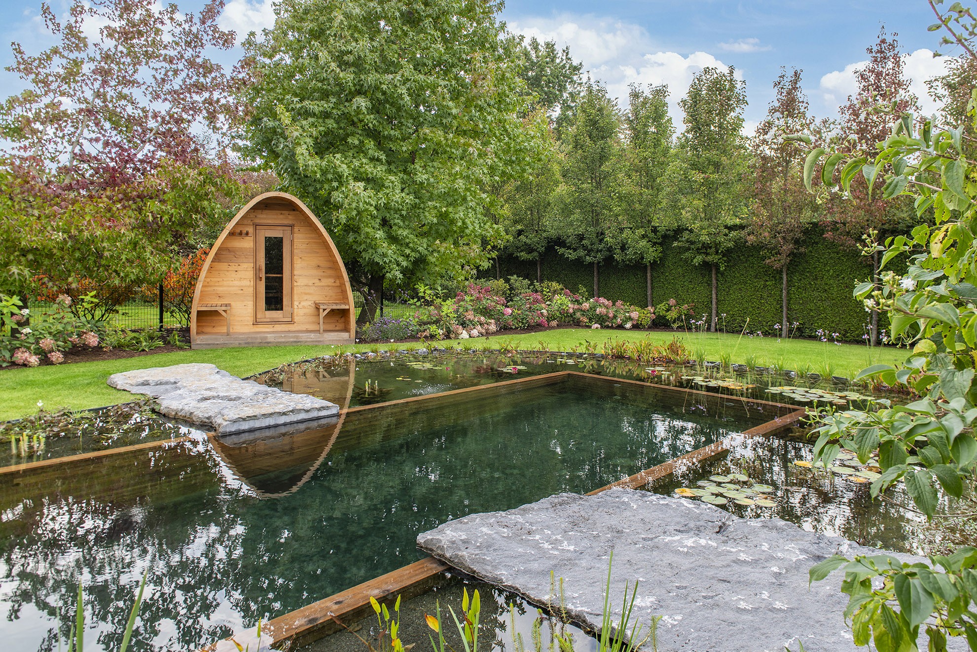 Cet étang de natation est vraiment très original. Le bassin de natation est construit entièrement en bois de mélèze européen, neutre en CO2, ce qui contribue non seulement à la durabilité du projet, mais lui donne un bel aspect naturel. Autour du bassin de natation, la grande variété de plantes de la zone plantée de forme libre purifie l'eau. L’écumeur à tamis à arc, adapté aux animaux d’étang, assure une filtration supplémentaire en éliminant les débris grossiers. De chaque côté de l'étang de natation, une impressionnante rangée de pierres naturelles met en valeur, avec l'escalier fait sur mesure et la terrasse en bois, le savoir-faire artisanal. Le sauna chauffé au bois, situé à côté de la piscine, rend l'expérience de ce jardin encore plus unique.