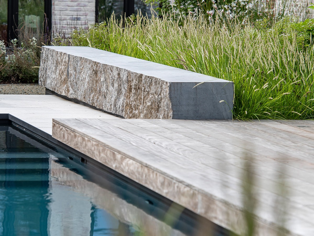 Cette élégante piscine naturelle est le coeur vibrant d'un jardin moderne à Zonhoven. La ligne architecturale de la maison se prolonge harmonieusement dans la conception aquatique, où des matériaux authentiques et robustes s'associent à des accents raffinés et contemporains. La finition en revêtement anthracite, associée à des blocs de pierre bleue, des bordures en calcaire et une terrasse en ipé, offre un équilibre parfait entre robustesse et subtilité. Un design bien pensé où l'architecture, l'eau et la végétation se renforcent mutuellement.