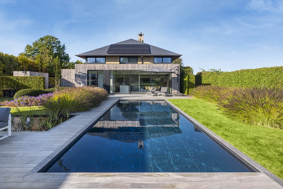 Cet élégant projet, réalisé par Hybrid Pools, associe le charme naturel d'un étang de baignade au confort d'une piscine moderne. Grâce à un système d'hydrolyse innovant, l'eau reste durablement cristalline, sans qu'il soit nécessaire d'utiliser des produits chimiques. Les lignes épurées, la surface de l'eau aux reflets anthracite et les plantations raffinées composées de calamus, potentille et d'iris renforcent l'atmosphère apaisante. Une combinaison parfaite entre technique, esthétique et nature, où luxe et simplicité vont de pair.