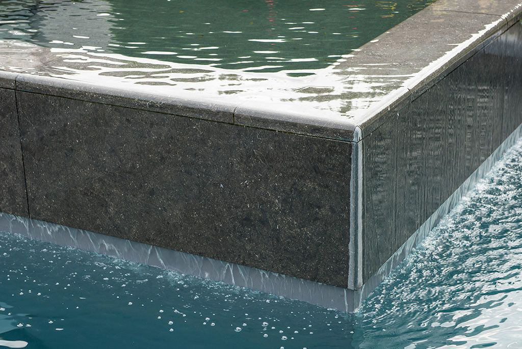 5. Divers : eau aspirée par des écumeurs d’angle, traitement de l’eau par filtre Triton 60 avec verre activé Bayrol et lampe UV, pompe Intelliflo, petit souffleur pour aérer la zone de lave, spot LED Spectravision