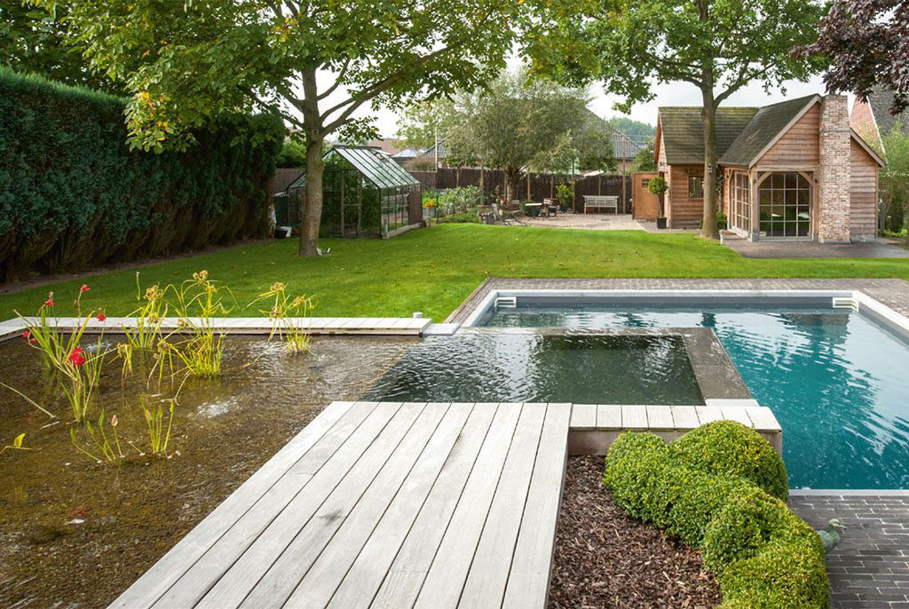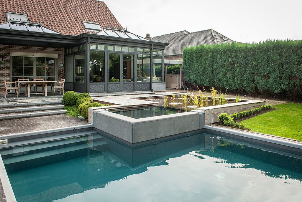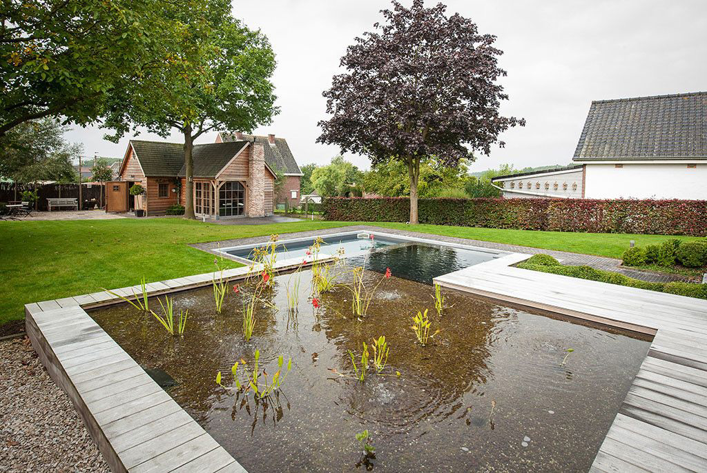 Les clients avaient déjà un étang, mais souhaitaient une piscine et un étang. Pour satisfaire ce souhait et exploiter au mieux la situation existante, vint l’idée d’un débordement depuis la zone de filtrage par une petite pataugeoire qui mène à la zone de baignade. La pataugeoire est principalement utilisée par les deux chiens de la famille qui adorent aussi boire l’eau de la piscine. Depuis l’espace de vie, on voit la lave et les plantes, ce qui confère un effet « infinity ». La zone de filtrage est entourée par une terrasse en bois dur grisé. La zone de baignade est bordurée de dalles d’argile.