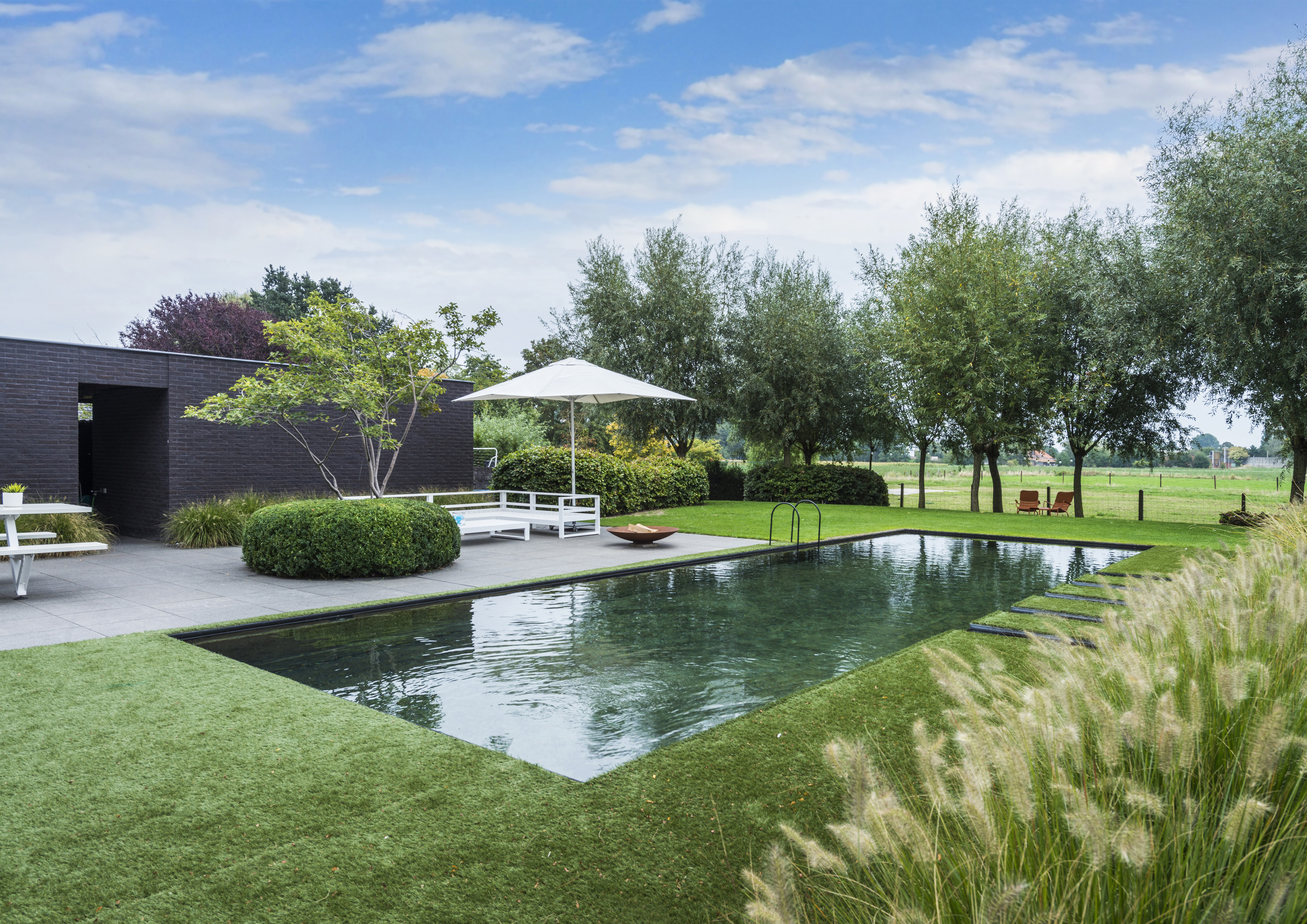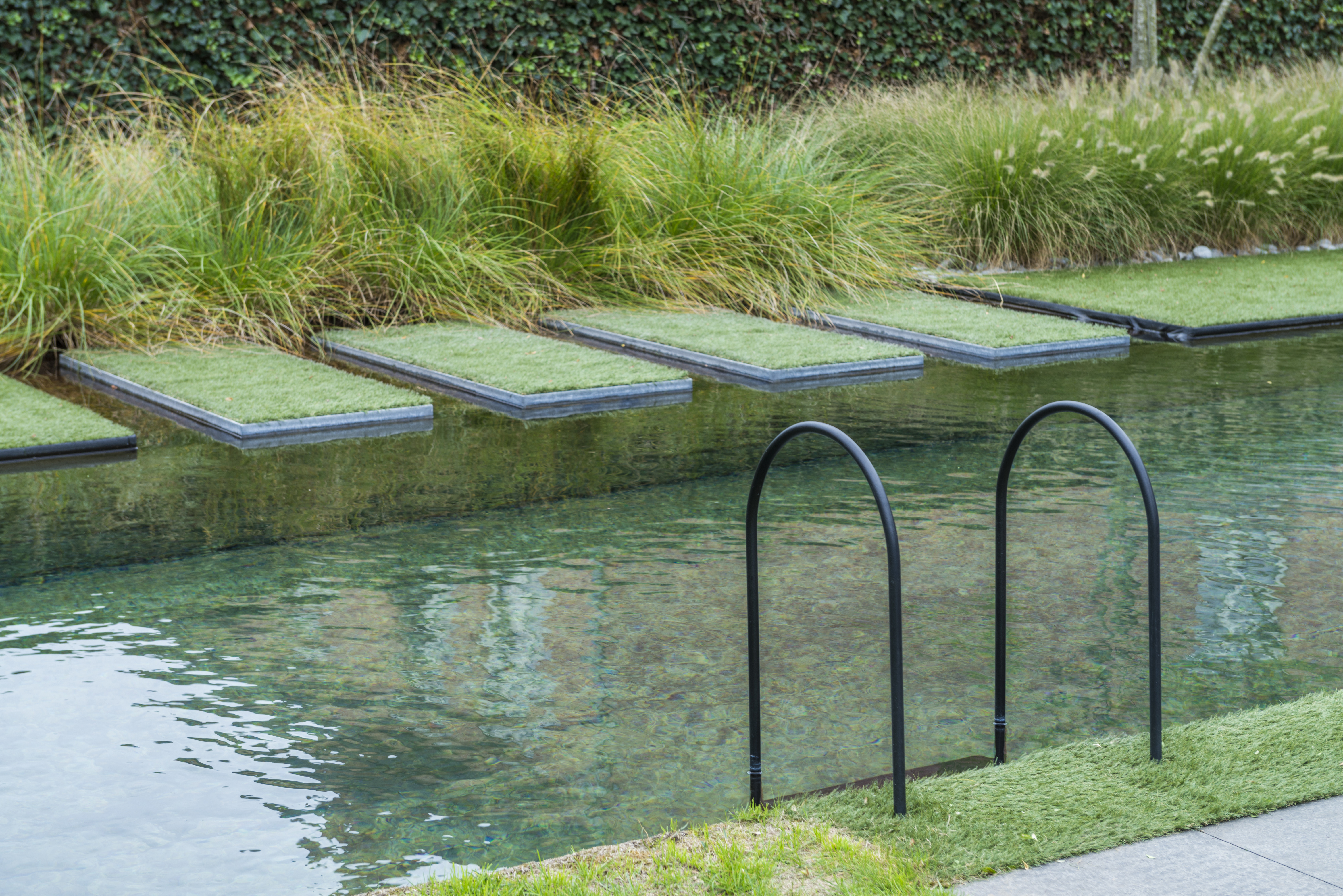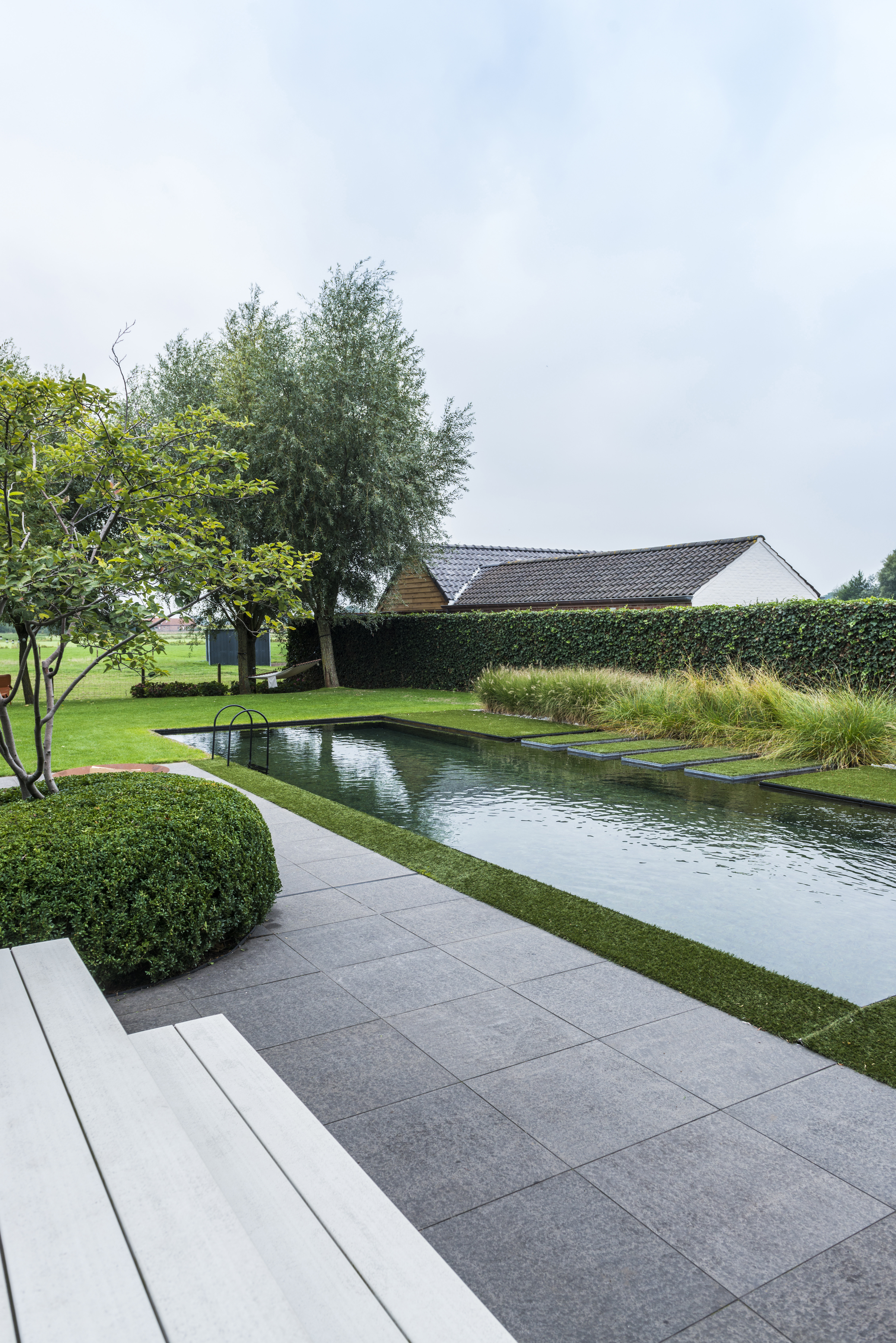 Un rectangle miroitant au milieu d’un jardin rustique sobre. On remarque surtout l’espace important entre l’étang et la lagune. L’eau passe par quelques canaux longs d’un mètre jusque dans la lagune, ce qui résulte en de larges pavés japonais revêtus de gazon synthétique. Le petit escalier d’accès noir élégant s’harmonise à merveille avec l’ambiance du jardin.