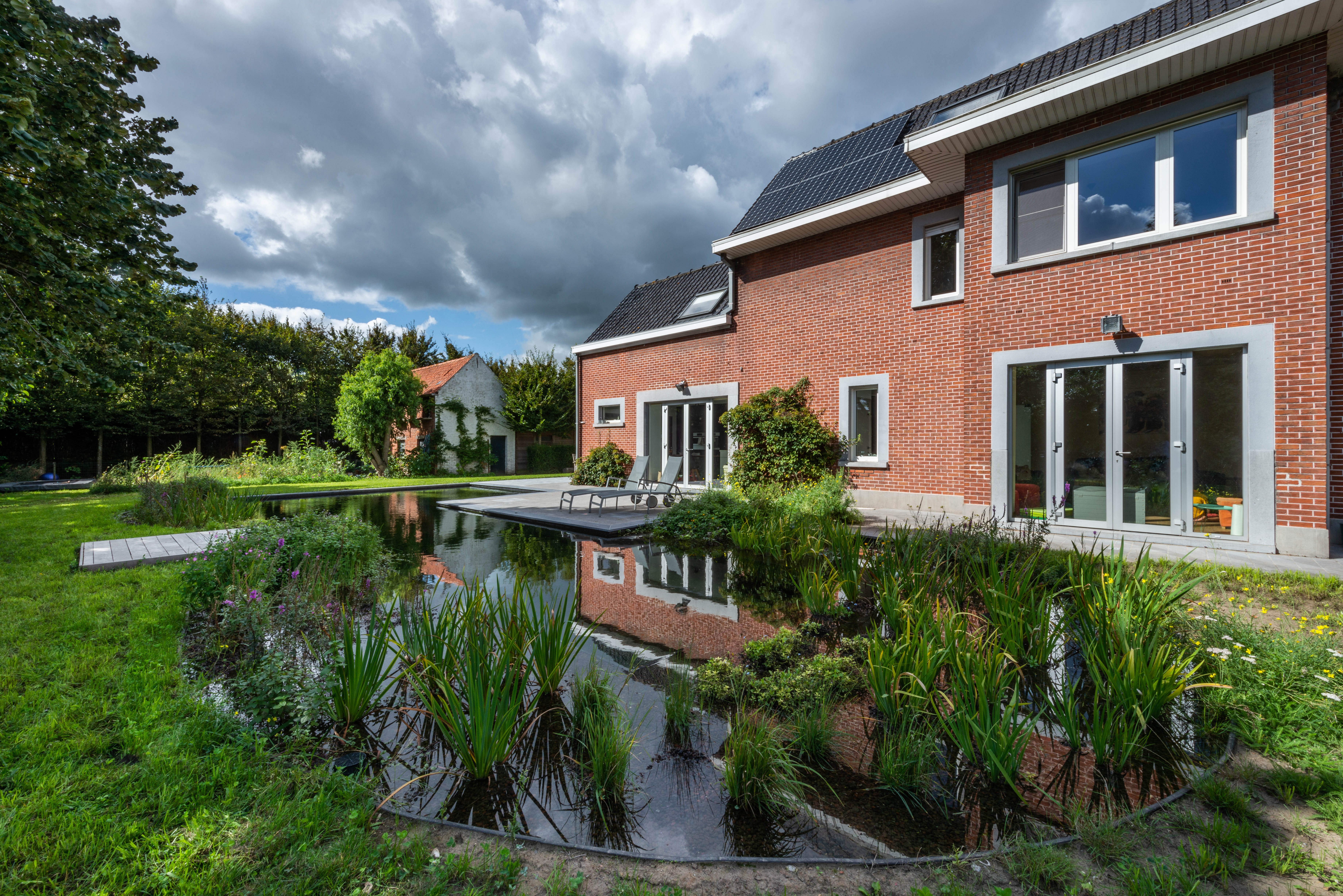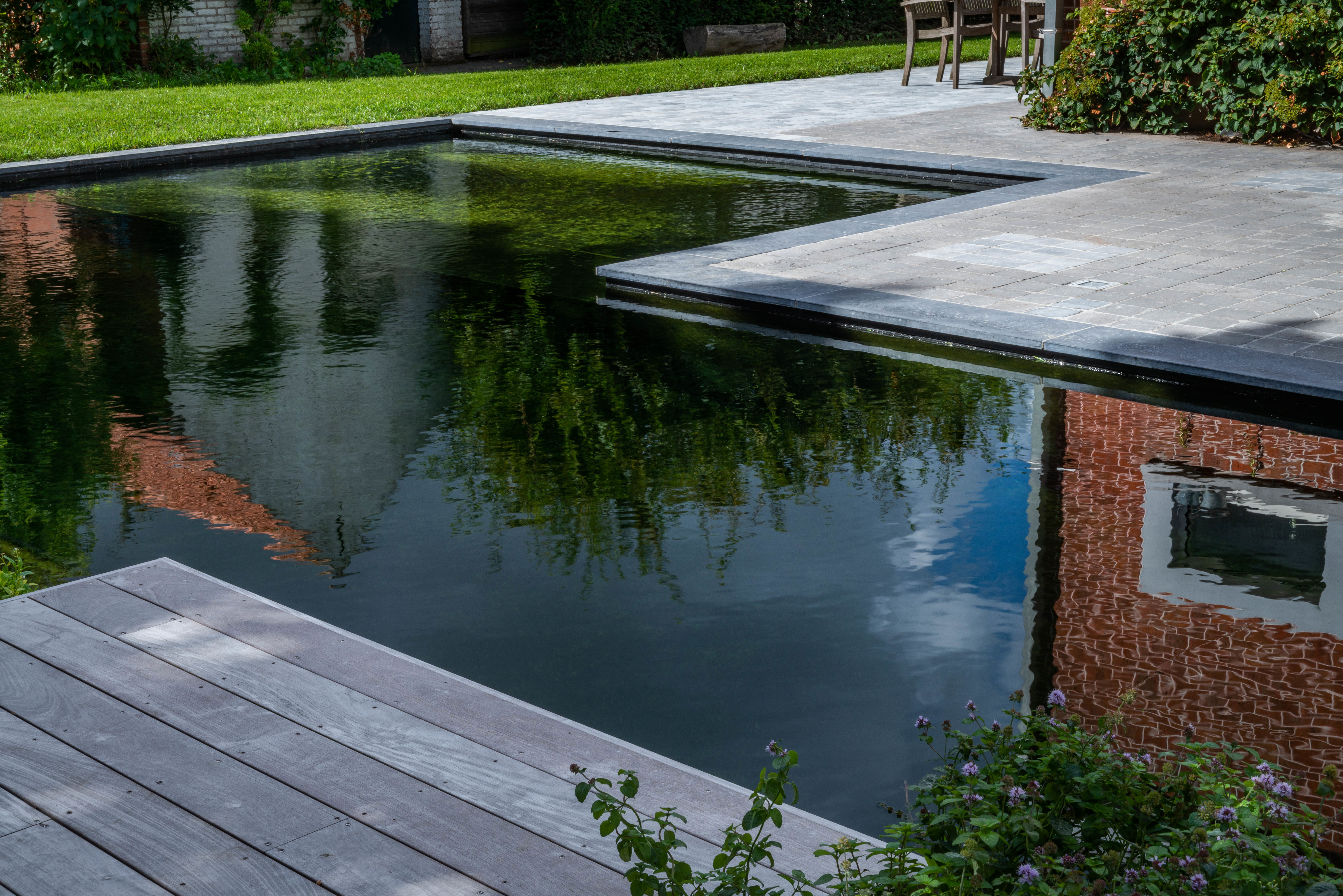 Cet étang de natation en L est divisé en deux parties : une « jambe » qui s'étend en un véritable canal de natation et aboutit à une zone végétale ludique. L'autre « jambe » fait office de plage ou d'aire de jeu où les enfants peuvent patauger à une profondeur sûre. En d'autres termes, il s'agit d'un projet très polyvalent. Pour faire des longueurs, jouer en toute sécurité, tout en profitant du soleil et bien entendu des plaisirs de l'eau naturelle. Cet étang de natation a tout pour plaire. En outre, pour le lagunage, on utilise toute une série de plantes colorées telles que le populage des marais, l'iris des marais, la salicaire commune, la menthe aquatique, le myosotis des marais, la petite massette, etc.