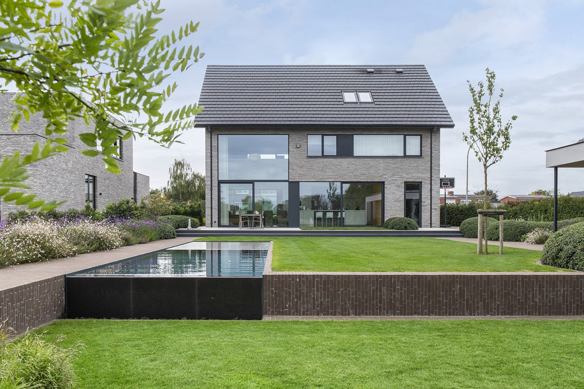 Ce projet de piscine, réalisé par l’entreprise Biopools Degroote Koen, présente un magnifique bord de débordement qui met en valeur le paysage vallonné situé derrière la propriété. Depuis la piscine, le regard est guidé vers la vue panoramique à l’arrière du jardin. Le liner gris foncé donne à l'eau une couleur profonde, presque dramatique. Mais les véritables vedettes de ce projet sont les clinkers en argile. Depuis le mur de soutènement qui absorbe la différence de niveau dans le jardin, jusqu'au bord de la piscine et à la finition de l'allée du jardin. Ce choix de matériau robuste donne à l'ensemble un résultat à la fois élégant et naturel.