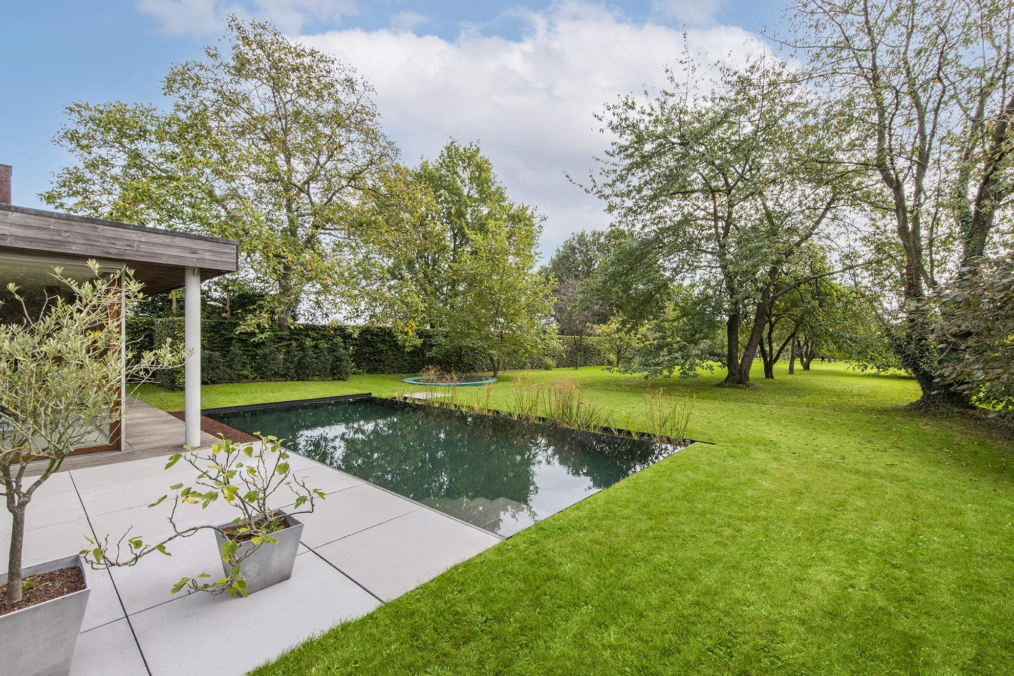 L’entreprise Plantarbor a créé un magnifique étang de baignade au design épuré. L'étang de nage est doté d'un côté à débordement sur lequel l'eau s'écoule selon un système de flux descendant vers la zone des plantes, qui est plus basse grâce à la pente naturelle du jardin. Bien qu' étroite, la zone de marais présente une riche variété de plantes filtrantes telles que l’Iris pseudocarus, l’Hippuris vulgaris, l’Acorus calamus et le Butomus umbellatus. L’étang de baignade est pourvu d’un bord en aluminium thermolaqué, qui permet à l’eau de s’écouler dans le terrain environnant en harmonie avec les arbres et la pelouse. Cela confère à l’ensemble un aspect particulier et raffiné. Un endroit parfait pour profiter de la beauté naturelle et de la fraîcheur de l'eau.