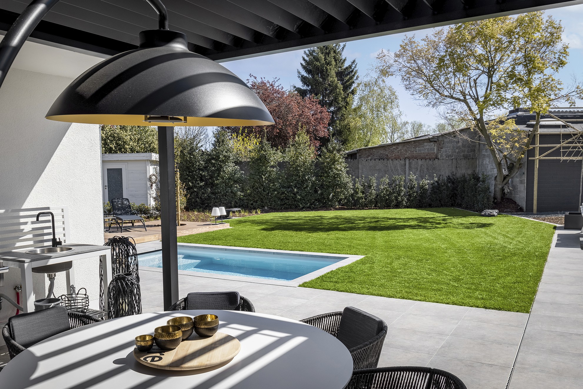 Avec ses 4,5 mètres sur 2,5 mètres, cette jolie piscine monobloc, modèle Urban Active de Starline, a les dimensions idéales pour ceux qui disposent d'un petit jardin de ville. Grâce à son débordement, elle dispose d'une ligne d'eau, haute et moderne. L'escalier cubiste avec plage immergée encastrée confère à la pièce d'eau un caractère unique. La margelle en carreaux de céramique, sciée à onglet, est parfaitement exécutée. Un joli spa et une terrasse en bois bien exposée complètent l'expérience du bien-être au jardin. Compact, fonctionnel et parfaitement fini, c'est ainsi que nous décrivons ce projet.
