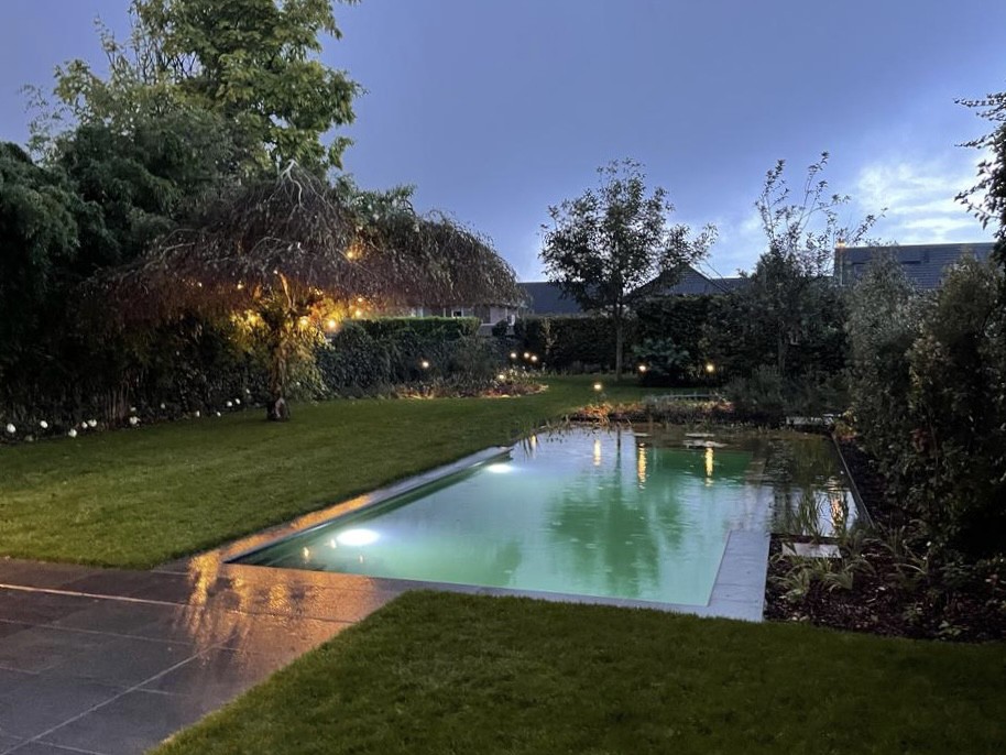 Ce jardin récemment rénové ne pouvait se passer d'un étang de baignade moderne. L'étang de natation a été construit par Hoveniersgebroeders selon le système innovant Biotop. Le résultat est une eau cristalline sans algues. Depuis l'espace de vie, les propriétaires accèdent directement à la terrasse pour se rafraîchir. La zone de baignade intelligemment conçue comporte une partie peu profonde de 1,20 m et une partie plus profonde de 1,80 m, offrant un environnement idéal pour une baignade détendue et d’agréables plongées.
