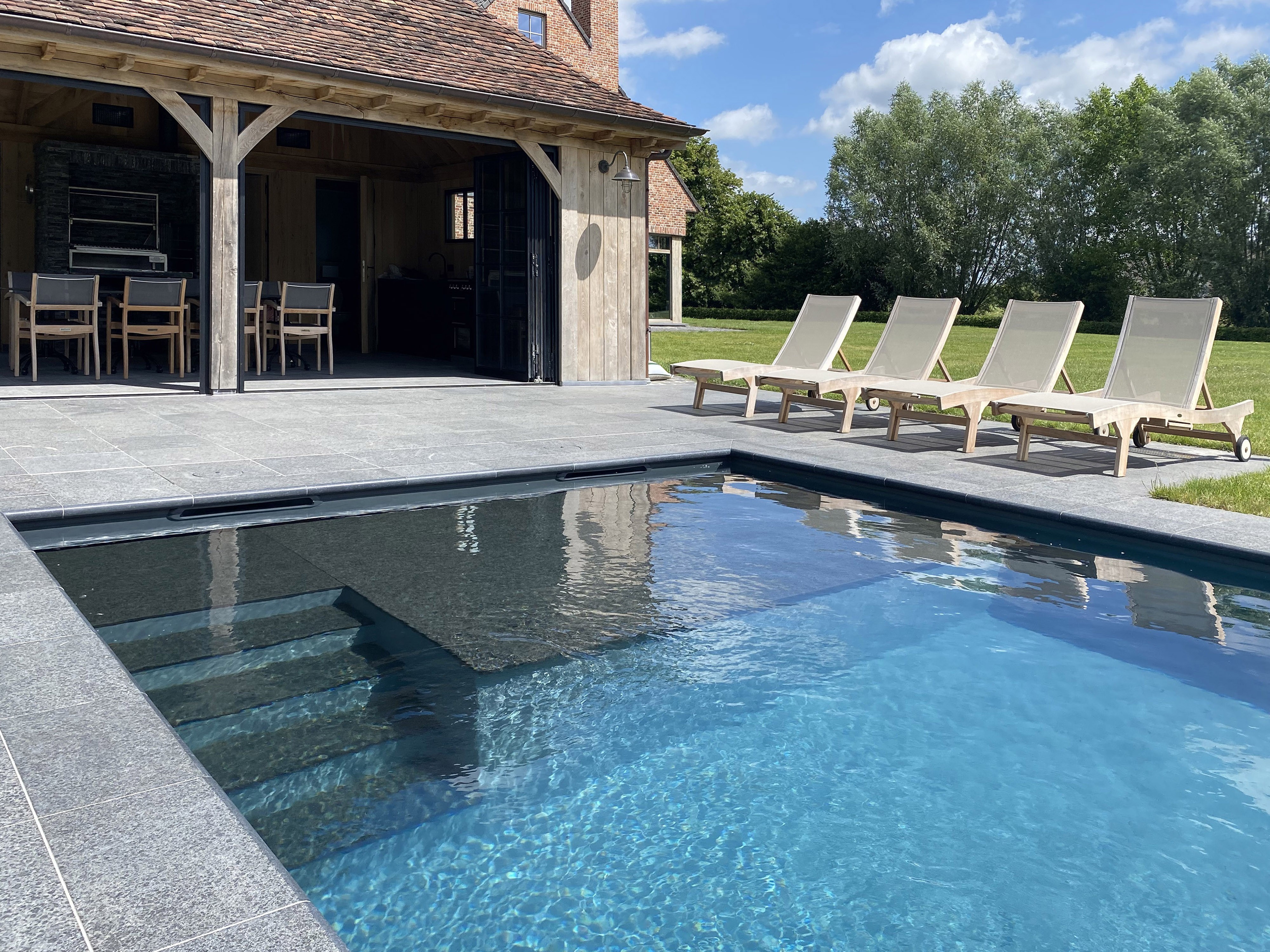 De larges vues, un magnifique pool house et les eaux douces d'une piscine biologique. Ce projet respire les vacances à tous les niveaux. Le choix des matériaux s'est porté sur une margelle en basalte avec un nez arrondi et un liner gris foncé. Un classique qui s'accorde parfaitement avec la piscine, son emplacement magnifique au milieu des champs et le superbe pool house de style champêtre avec cuisine intégrée, barbecue et douche extérieure. Le point fort de la piscine est la plage assise extra-large, avec des marches encastrées. Cette plage a été ajoutée à la demande du client, qui souhaitait absolument disposer d'un espace de jeu spacieux pour ses petits-enfants.