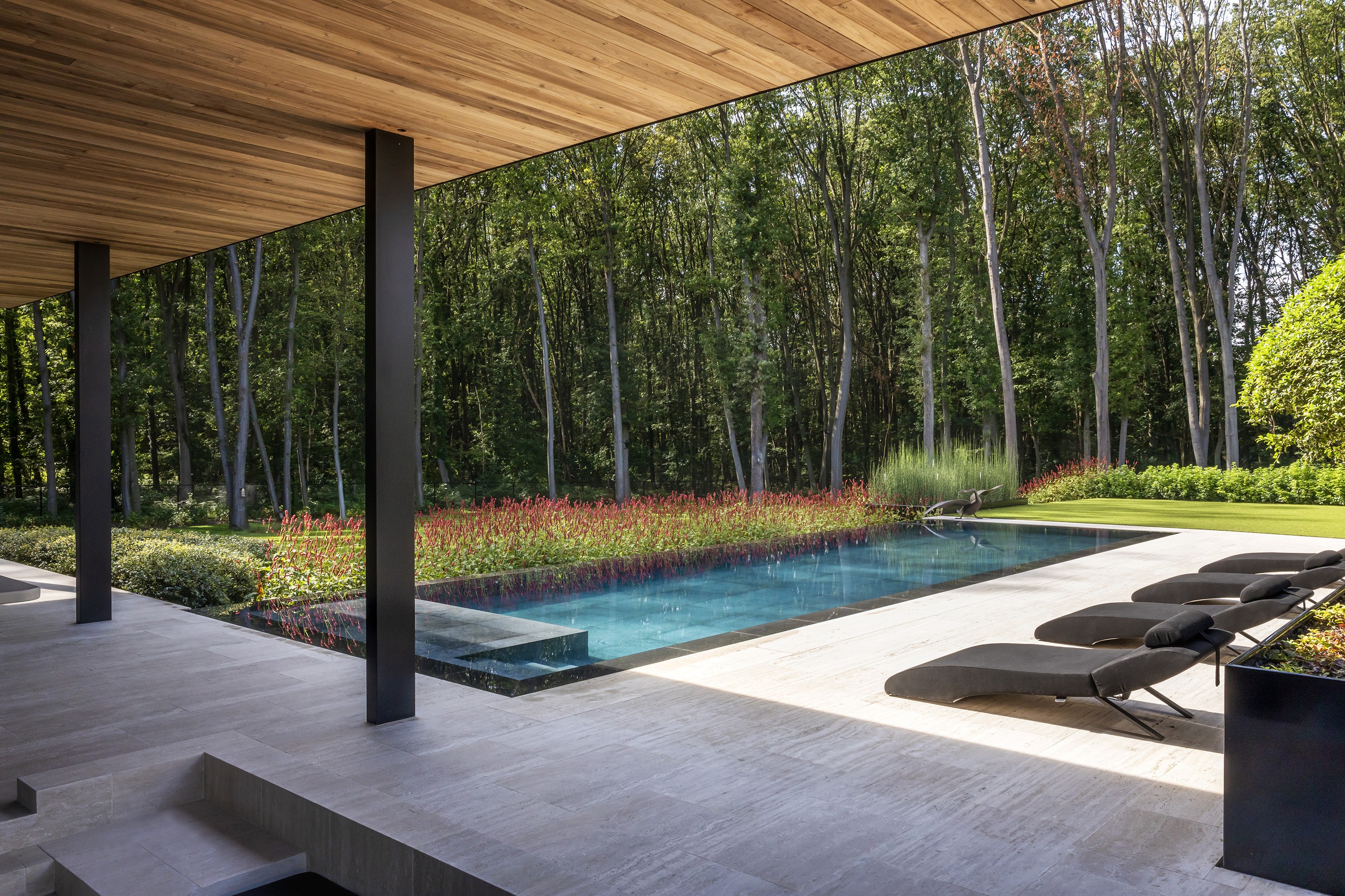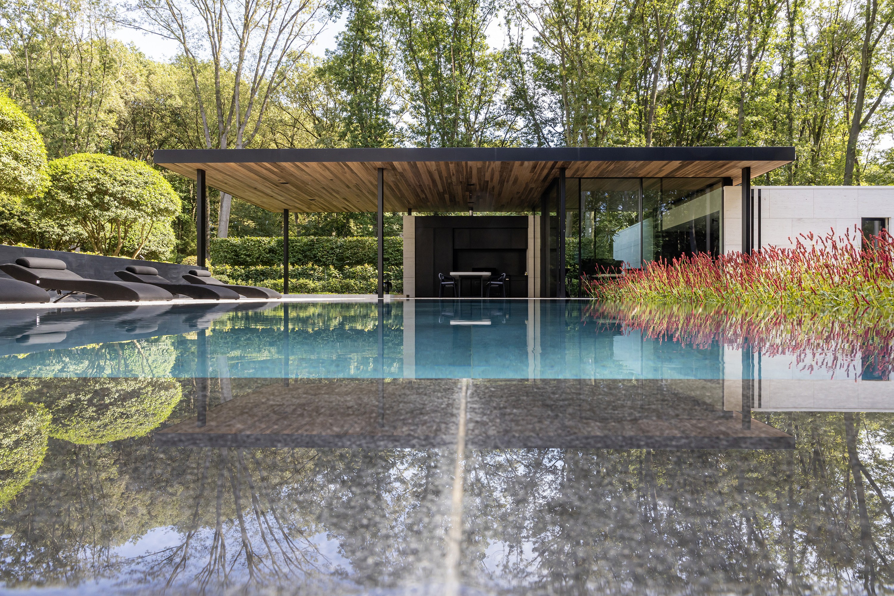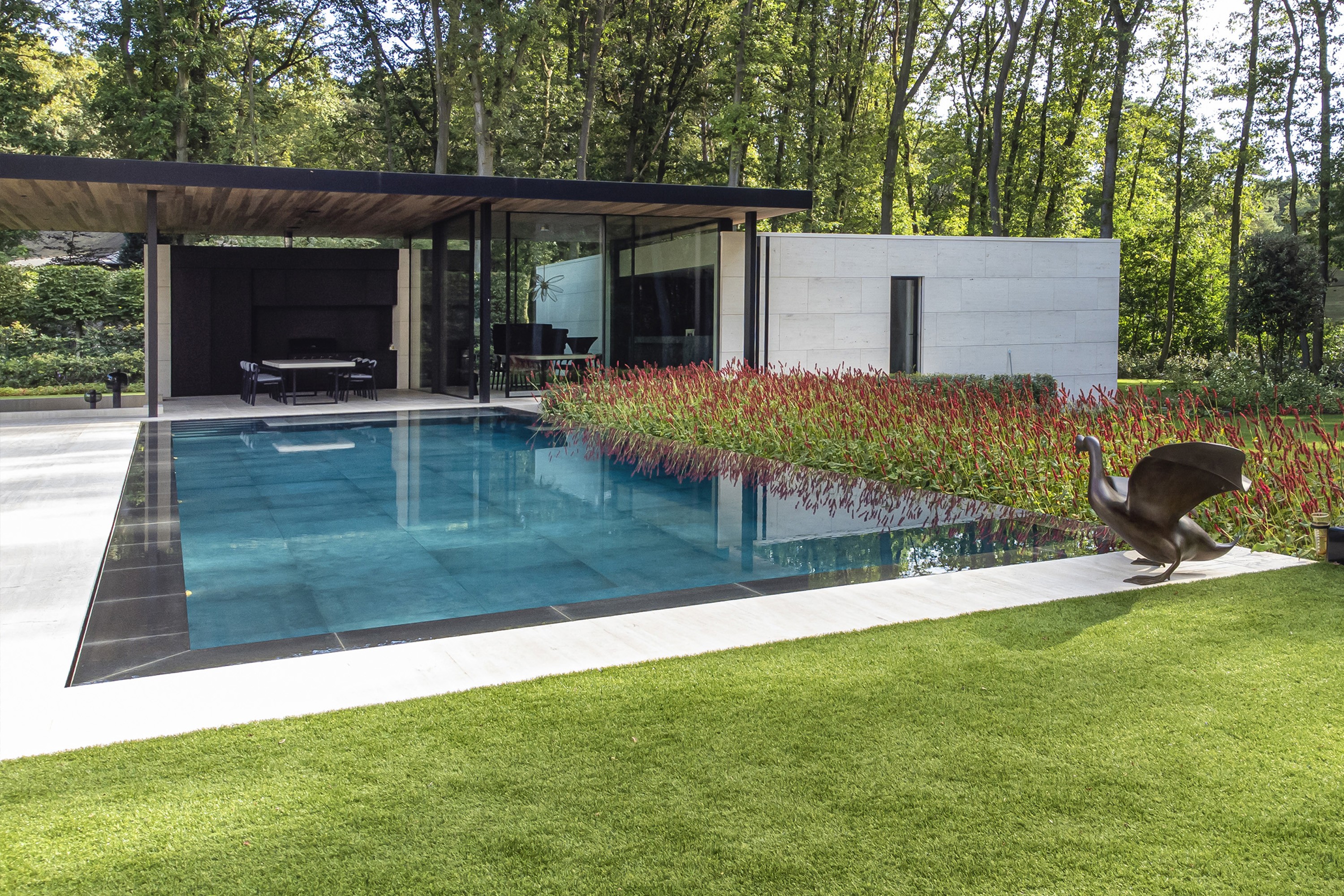 Cette piscine à débordement unique à Zolder a été réalisée avec un savoir-faire exceptionnel par l'équipe de Swimtec. Le fond est revêtu d'élégants carreaux de céramique foncée de 80 x 80 cm, créant un magnifique contraste avec les façades modernes de la villa, de couleur sable. En automne, la piscine prend ainsi des allures d'étang. Les carreaux de céramique sont soigneusement posés à l'aide d'une colle époxy. Le chauffage de la piscine est assuré par une pompe commandée par un inverseur et la vitesse de la pompe de circulation est contrôlée. L'ensemble forme un charmant tableau. La couleur profonde de l'eau contraste magnifiquement avec le parterre en bordure de fleurs rouge-vert (Persicaria amplexicaulis ‘Speciosa’). Le bord de débordement longeant ce parterre donne l'illusion que l'eau déborde dans les plantes qui, ainsi, se reflètent dans l’eau de la piscine comme un tableau vivant.