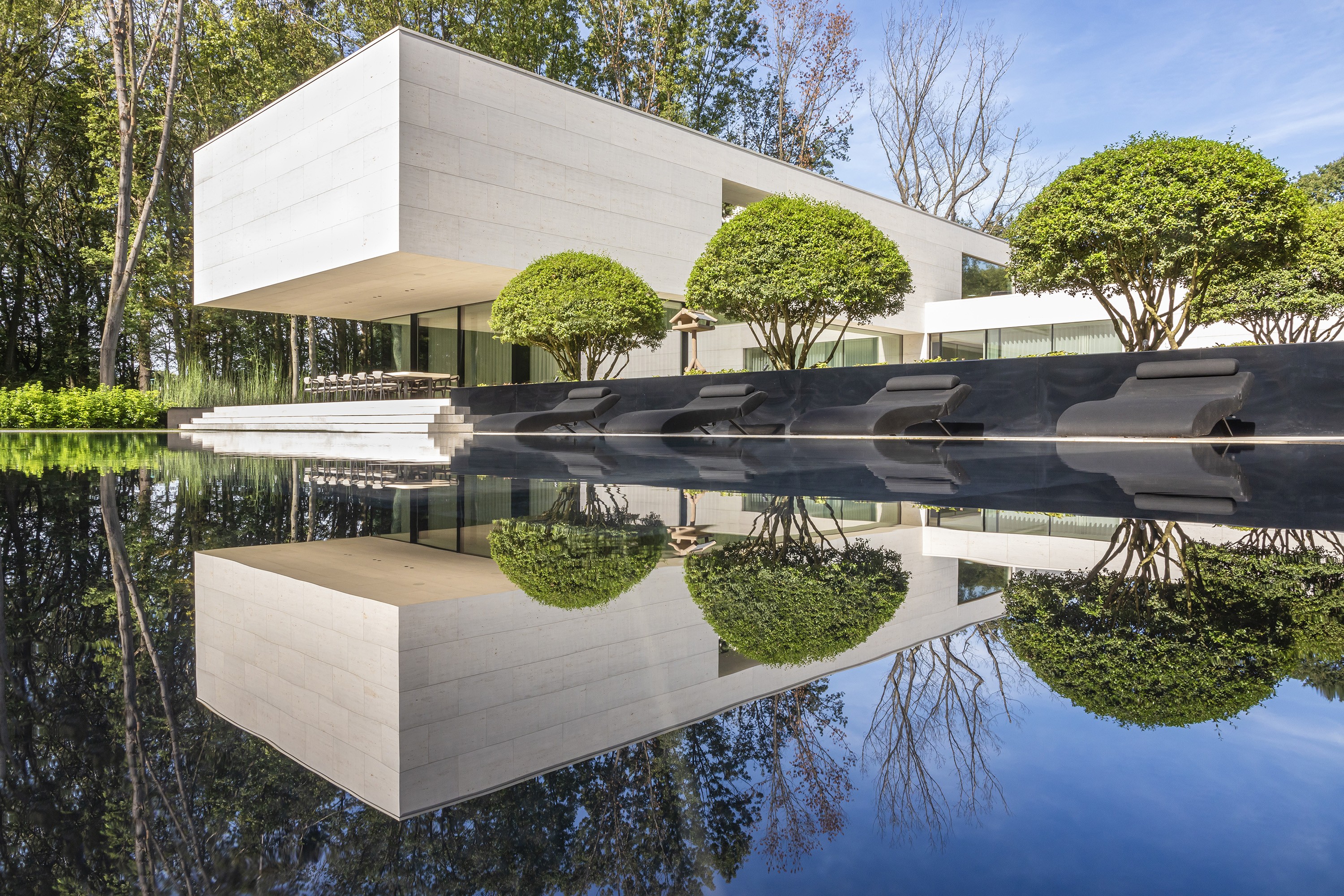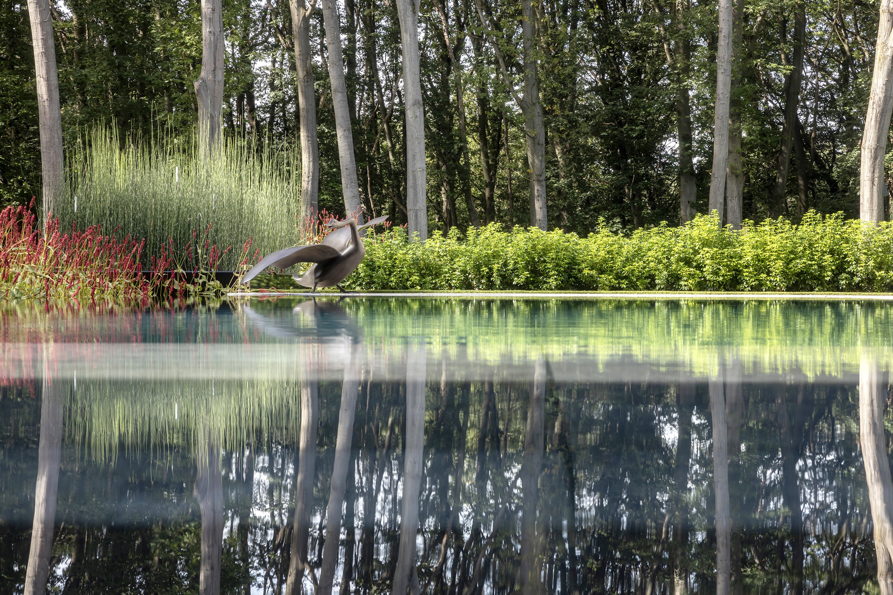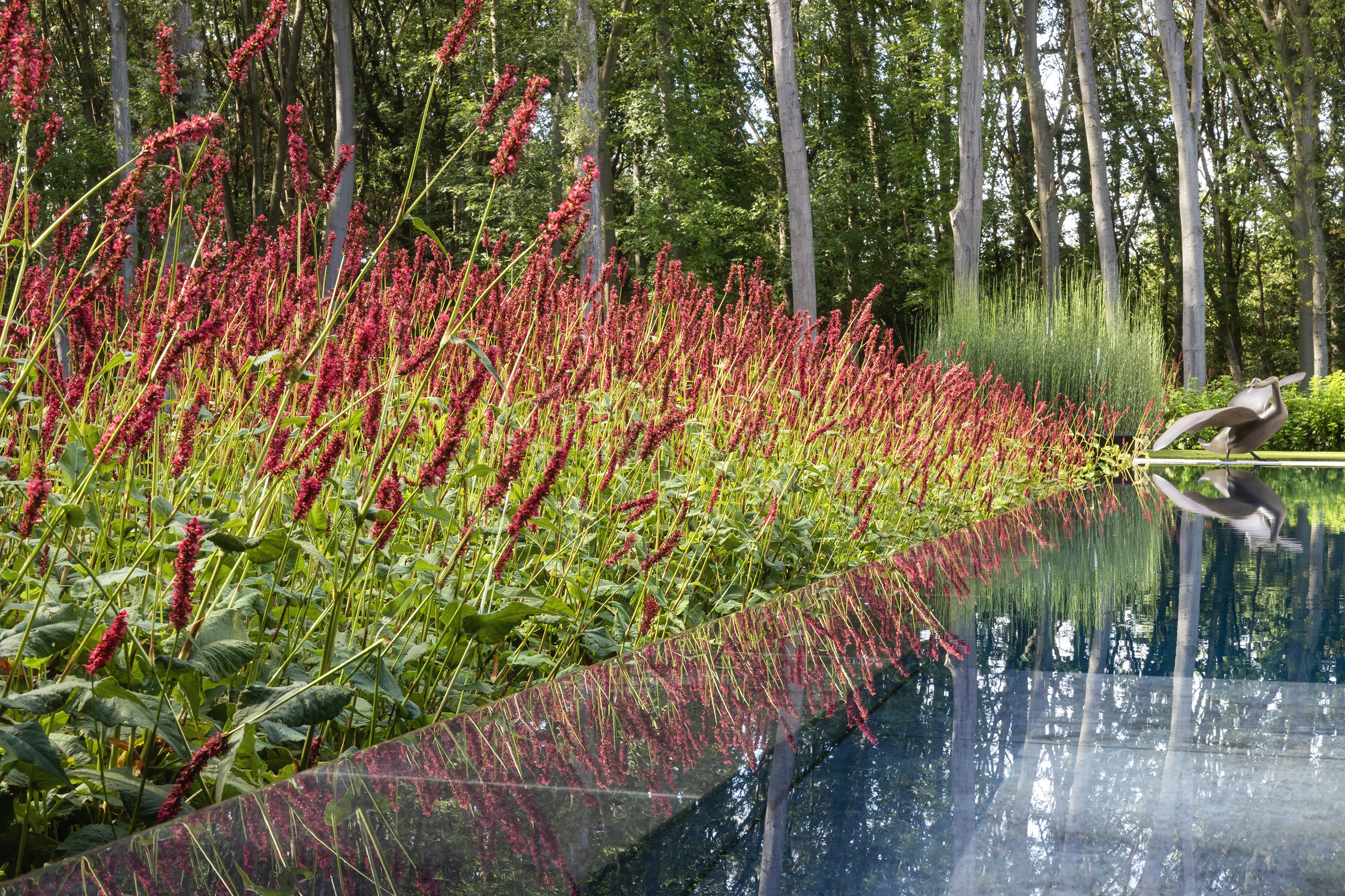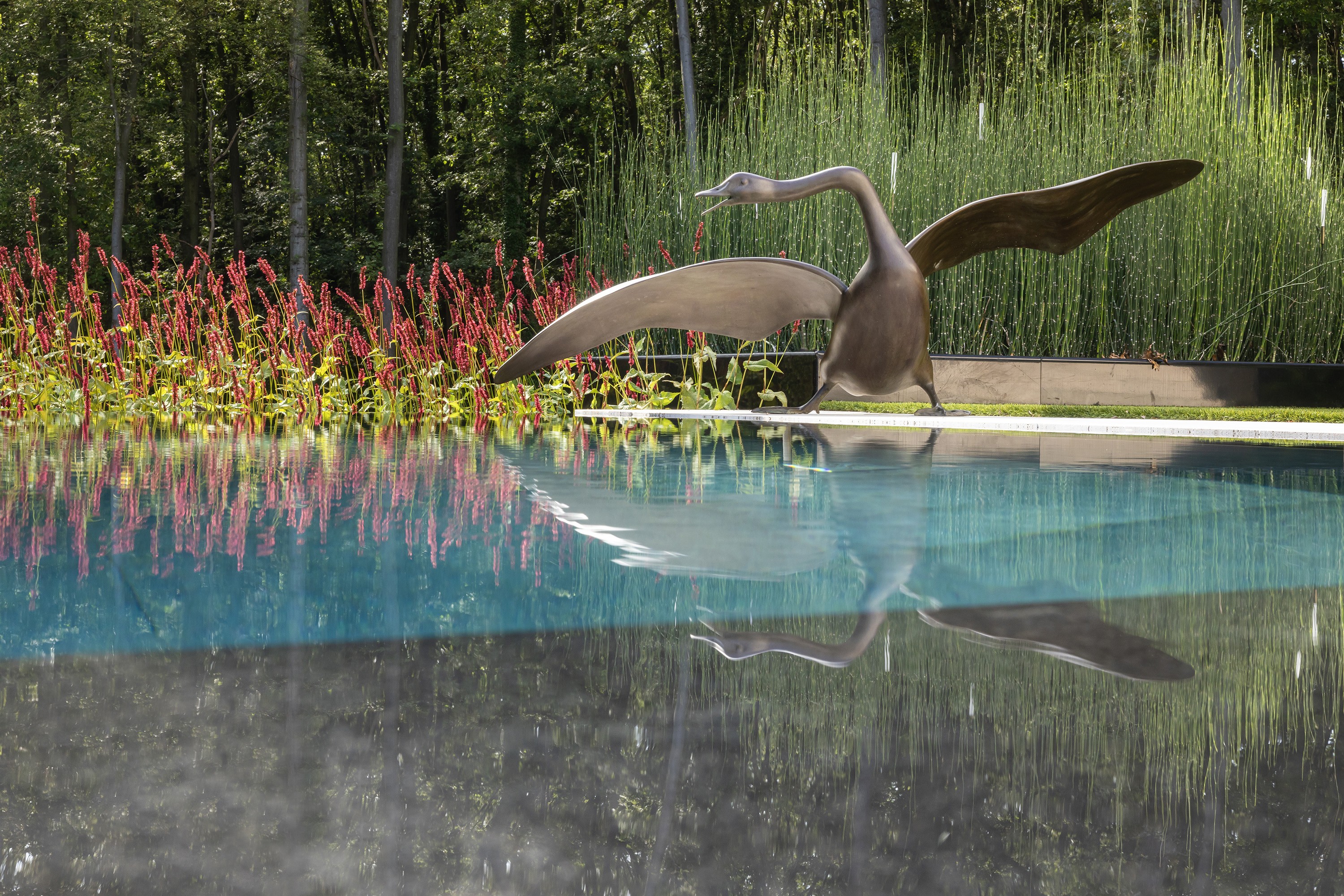 Cette piscine à débordement unique à Zolder a été réalisée avec un savoir-faire exceptionnel par l'équipe de Swimtec. Le fond est revêtu d'élégants carreaux de céramique foncée de 80 x 80 cm, créant un magnifique contraste avec les façades modernes de la villa, de couleur sable. En automne, la piscine prend ainsi des allures d'étang. Les carreaux de céramique sont soigneusement posés à l'aide d'une colle époxy. Le chauffage de la piscine est assuré par une pompe commandée par un inverseur et la vitesse de la pompe de circulation est contrôlée. L'ensemble forme un charmant tableau. La couleur profonde de l'eau contraste magnifiquement avec le parterre en bordure de fleurs rouge-vert (Persicaria amplexicaulis ‘Speciosa’). Le bord de débordement longeant ce parterre donne l'illusion que l'eau déborde dans les plantes qui, ainsi, se reflètent dans l’eau de la piscine comme un tableau vivant.