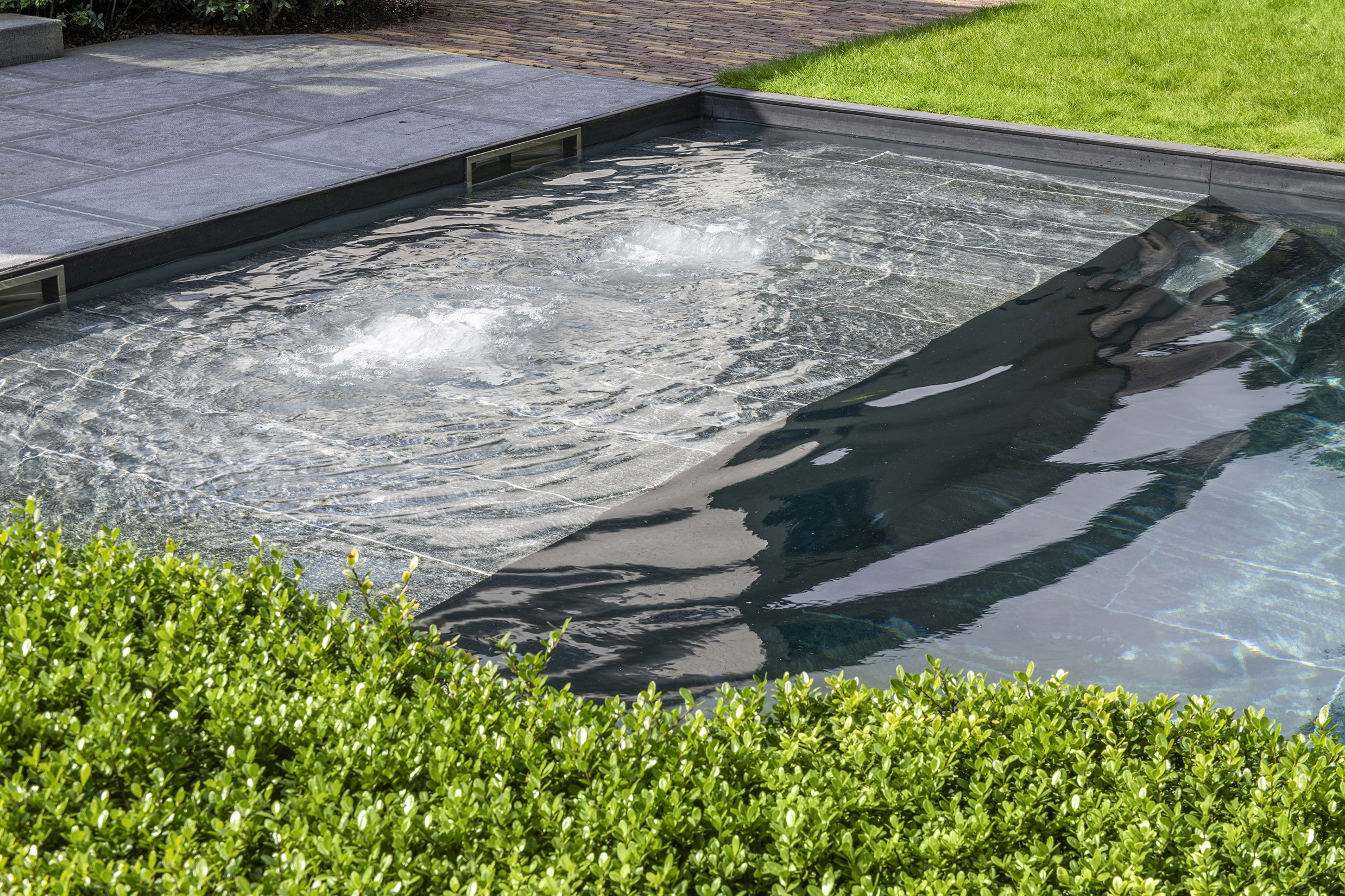 Cet étang de natation hybride est luxueusement fini avec des dalles de pierre naturelle allongées sur le fond, la plage et les escaliers. L'eau est cristalline grâce à la combinaison de l'hydrolyse et d'un système de débit descendant et marais filtrant. Les deux buses de la plage ajoutent une touche ludique et donnent vie à l'eau grâce à leur effet effervescent. On notera également le choix de skimmers à ligne haute d'eau, qui confèrent à l'endroit un aspect élégant et moderne. Le plan d'eau borde l'agréable terrasse en bois. Pour que l’image soit complète, un coin salon confortable a été créé au fond du jardin, avec un brasero pour plus d'ambiance.