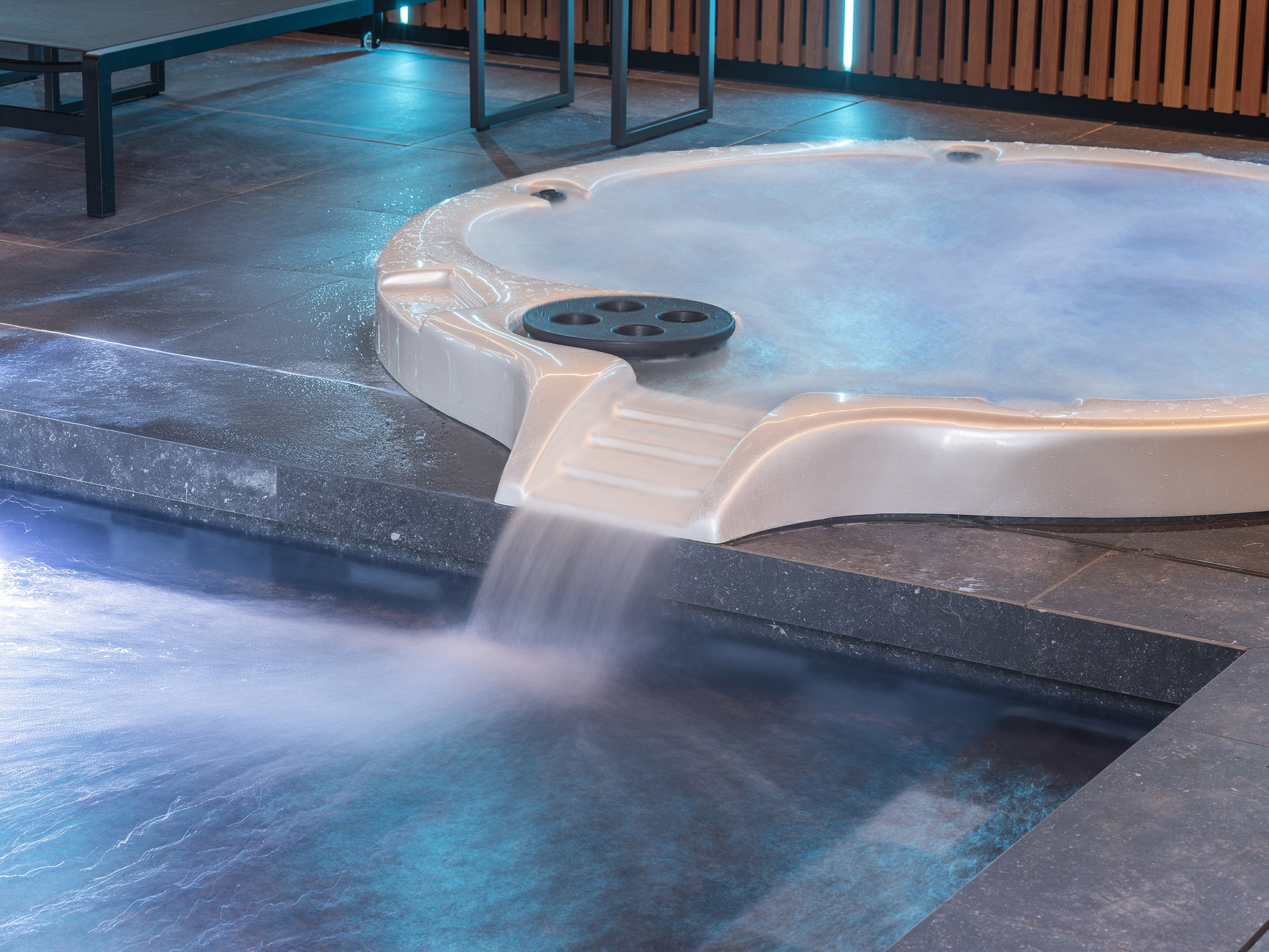 La piscine est recouverte d'un revêtement d'aspect carrelé. La bordure est constituée de carreaux de céramique qui ressemblent visuellement à de la pierre bleue. Sous la bordure, des plinthes sont posées dans le même matériau, solution intelligente et personnalisée permettant d'éviter que la ligne d'eau ne marque le liner. Enfin pour compléter l’ensemble, le lambris en bois, éclairé par des bandes LED modernes, crée une atmosphère chaleureuse et une acoustique relaxante.