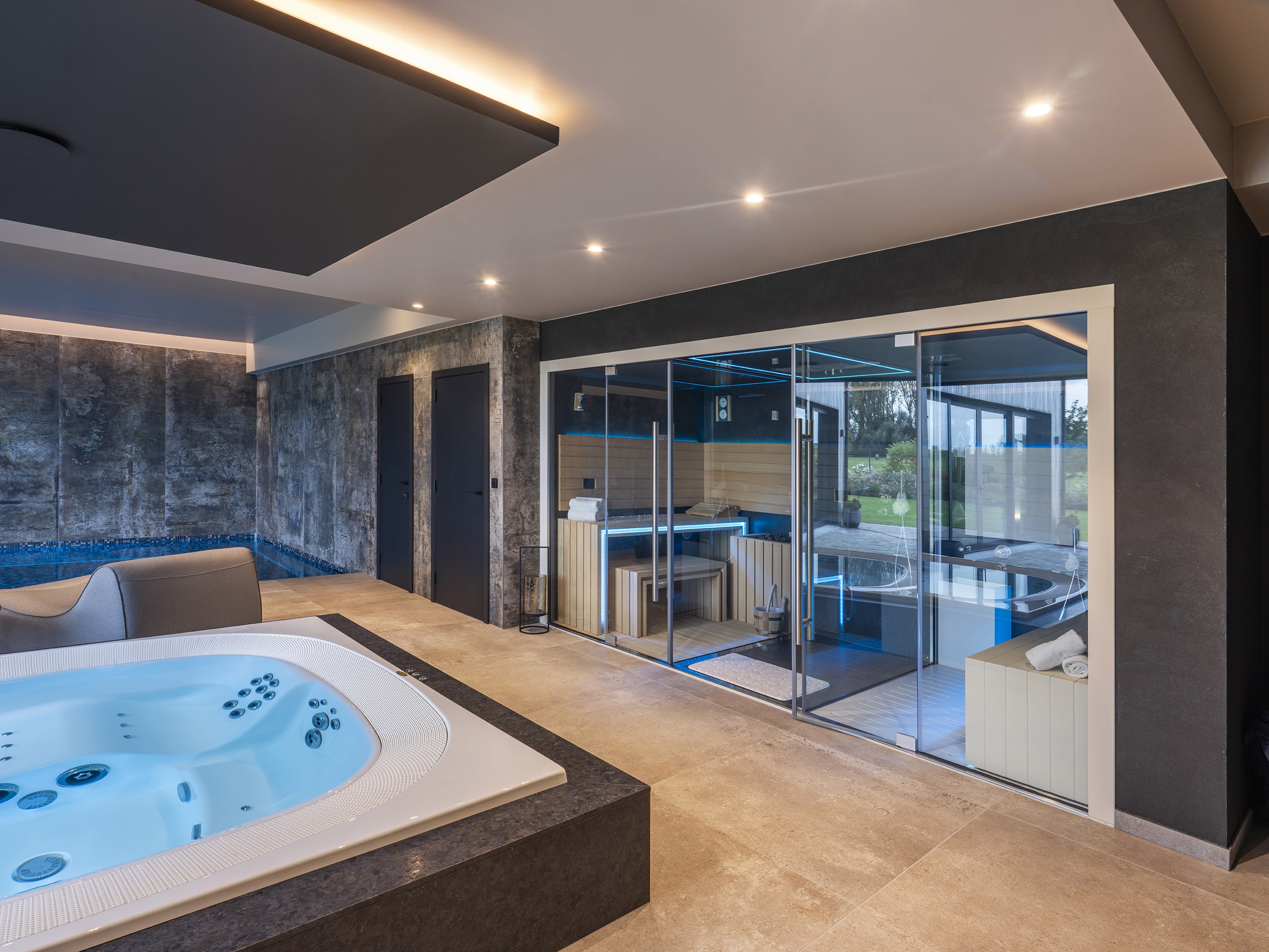 Cette accueillante piscine intérieure présente une finition en carreaux de céramique Ezzari, très sophistiquée, de couleur Gin Fizz. Ces carreaux confèrent à l'eau une palette de couleurs dynamiques et vibrantes, allant d’un bleu profond à des tons plus clairs. Les carreaux ont été placés avec la plus grande précision : on l’observe dans la bordure inclinée qui marque la transition entre l'escalier et le sol. C’est un repère visuel, améliorant la visibilité et la sécurité sous l'eau. Outre un plongeon dans une eau bleue, les propriétaires peuvent également se détendre dans la luxueuse unité de bien-être Sasha de Jacuzzi, qui réunit sauna, douche d'expérience et hammam. Bien entendu, un spa Jacuzzi est également disponible pour une relaxation complète.