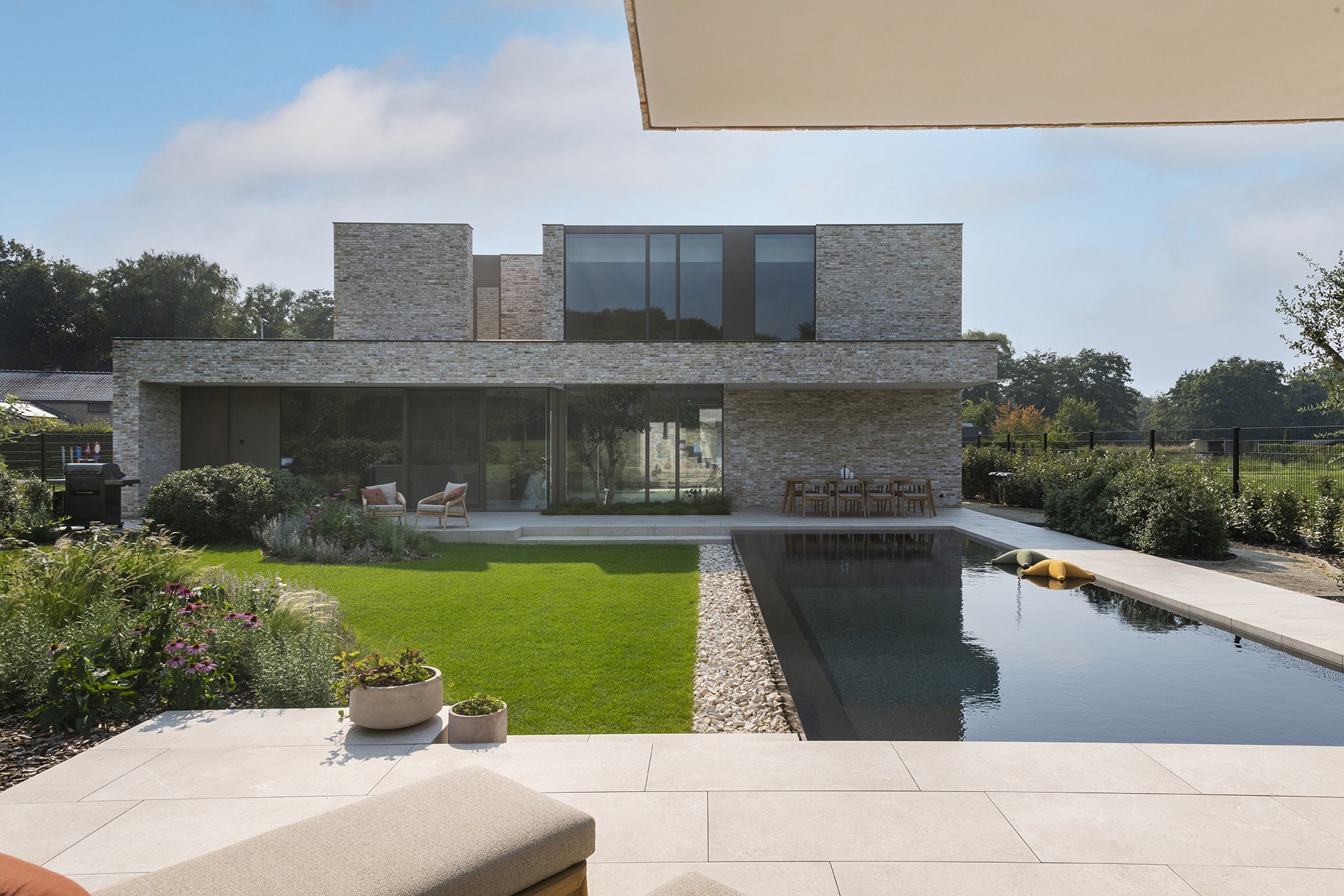 De haut en bas - ou plutôt du bord au fond - cette piscine est recouverte de noir. Cela lui confère un cachet très spécial, comme un smoking. Le choix du noir pour le liner, la plage et le bord de débordement en granit permet d'obtenir une pièce d'eau élégante et rectangulaire, avec une eau d'une couleur encre profonde. Une touche de chaleur est ajoutée au projet en utilisant dans le canal de débordement des carreaux de céramique beige et de gros galets. Tout comme la pierre de la façade du pool house, le confortable mobilier de jardin et les coussins flottants d'Ogo ajoutent charme et convivialité à l'ensemble.