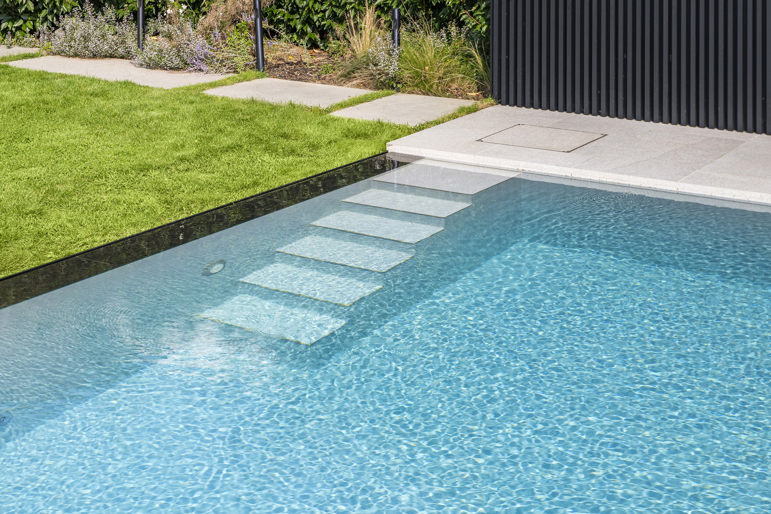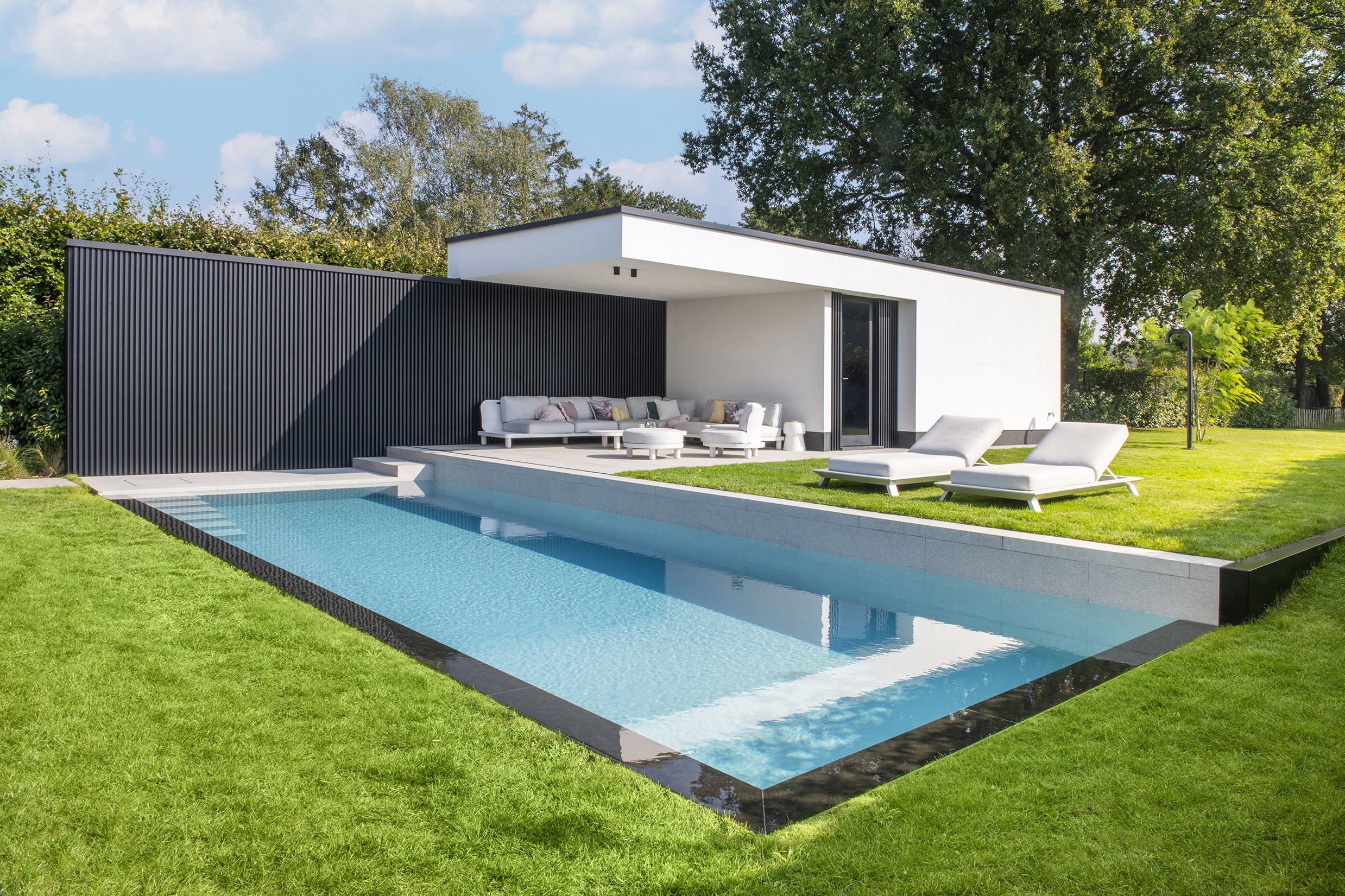 Pour beaucoup de personnes, une piscine dans le jardin signifie un apport quotidien de bonheur supplémentaire. Les propriétaires de ce projet, réalisé par l’entreprise Lamberts+Swinnen, sont très satisfaits du résultat. La piscine, encastrée dans le dénivelé de la propriété, forme avec le pool house et la douche extérieure, une oasis moderne dans le jardin. Pour souligner cette différence de hauteur, on a décidé de laisser les carreaux de céramique se poursuivre de la terrasse jusqu'au fond de la piscine. La moitié de la margelle est constituée d'un bord de débordement en granit noir magnifiquement réfléchissant. Cette couleur noire est considérée comme un atout dans la finition du pool house, faisant de ce lieu du jardin un endroit charmant.