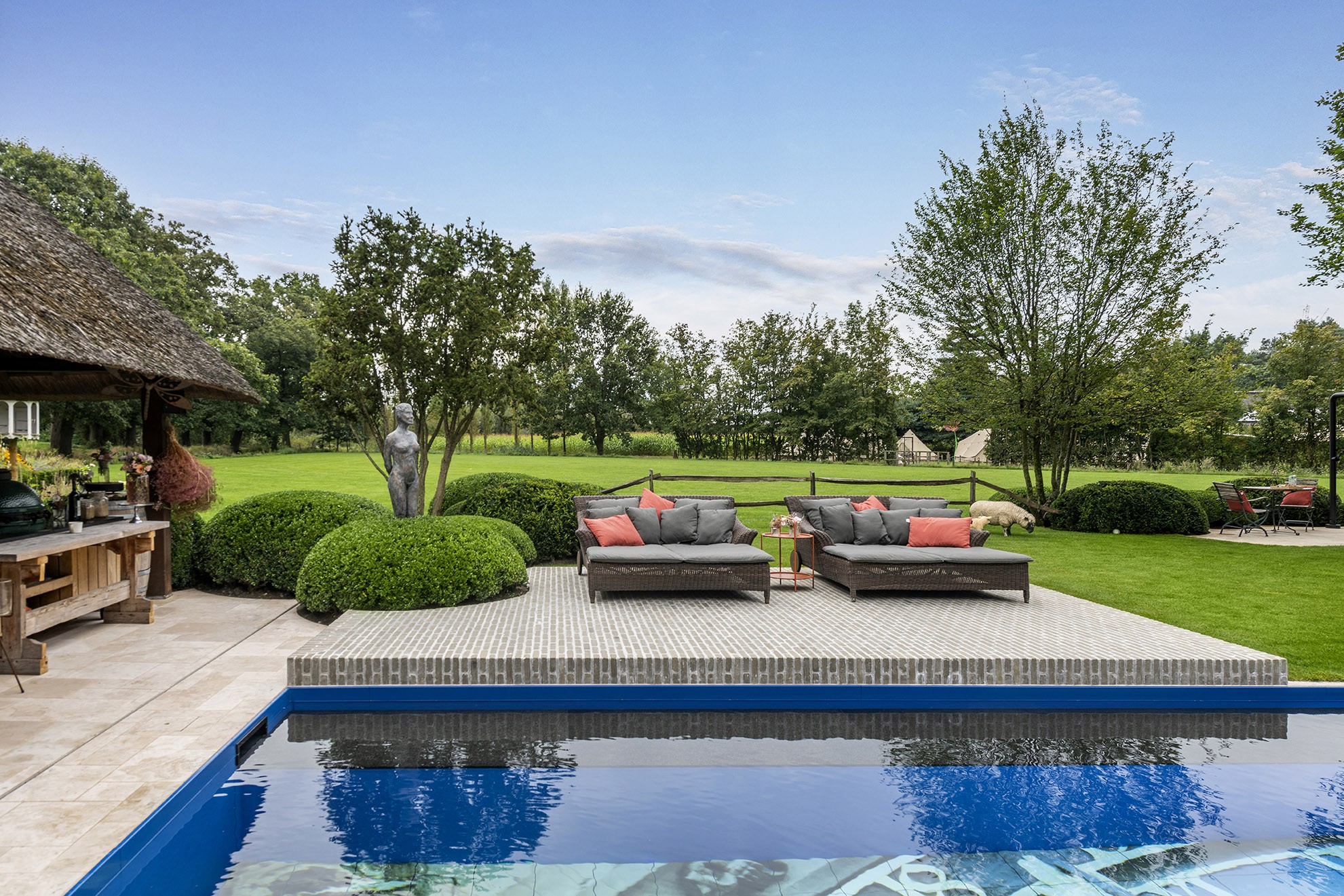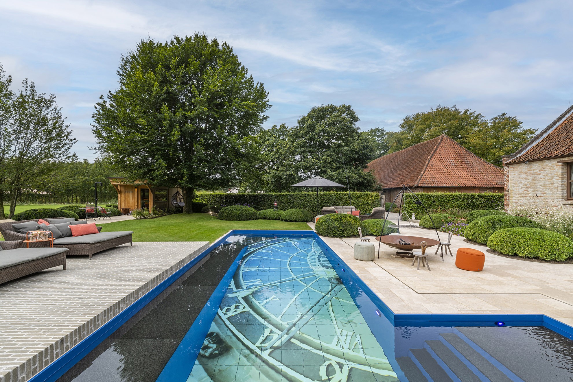 Dans cette ferme du XIIe siècle, la piscine devait être en harmonie avec le caractère historique du bâtiment. L'idée est née de construire une piscine ultramoderne, avec un profilé de bordure de gazon, un traitement de l'eau par hydrolyse et une couverture fluide, mais aussi un clin d'œil à l'époque d'autrefois visible au fond de la piscine, où des carreaux de céramique posés forment l’image intégrée de l'horloge astronomique médiévale de Prague. La conversion de l'image en carreaux de céramique adaptés à une utilisation sous l'eau a été un véritable défi. De plus, c'était un véritable casse-tête de placer les carreaux au bon endroit pour s'assurer que l'image était correcte. Grâce aux efforts d'Hybrid Pools, le résultat est tout à fait remarquable. Un travail de réflexion et d'artisan astucieux !