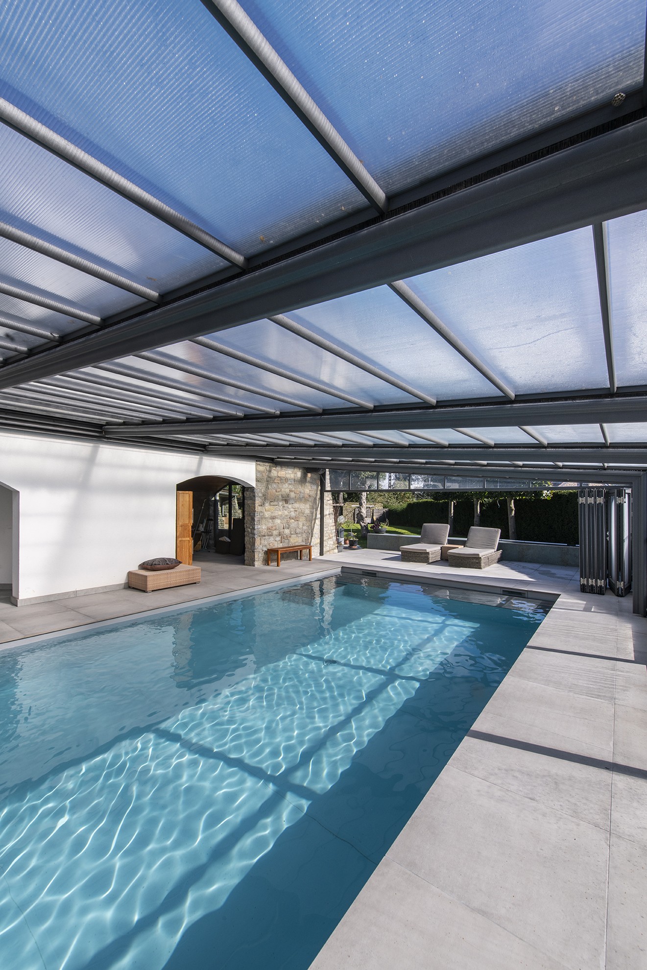 L’entreprise Vert et Bois a complètement transformé une piscine de forme libre datant de 1993 en une piscine moderne et élégante. Le plus grand défi de ce projet était que l'auvent existant devait rester intact. Cela a entravé l'accès au site et au local technique pendant les travaux, ce qui a compliqué cette rénovation. Le résultat est cependant une belle piscine rectangulaire dans laquelle l'espace peut être utilisé au maximum pour faire des longueurs, ce qui était impossible en raison de la forme libre de l'ancienne piscine. L'auvent, sous lequel on peut se tenir debout, maintient non seulement l'eau chaude mais évite l'évaporation. Il confère également à ce projet la particularité d'être en partie piscine intérieure et en partie piscine extérieure.