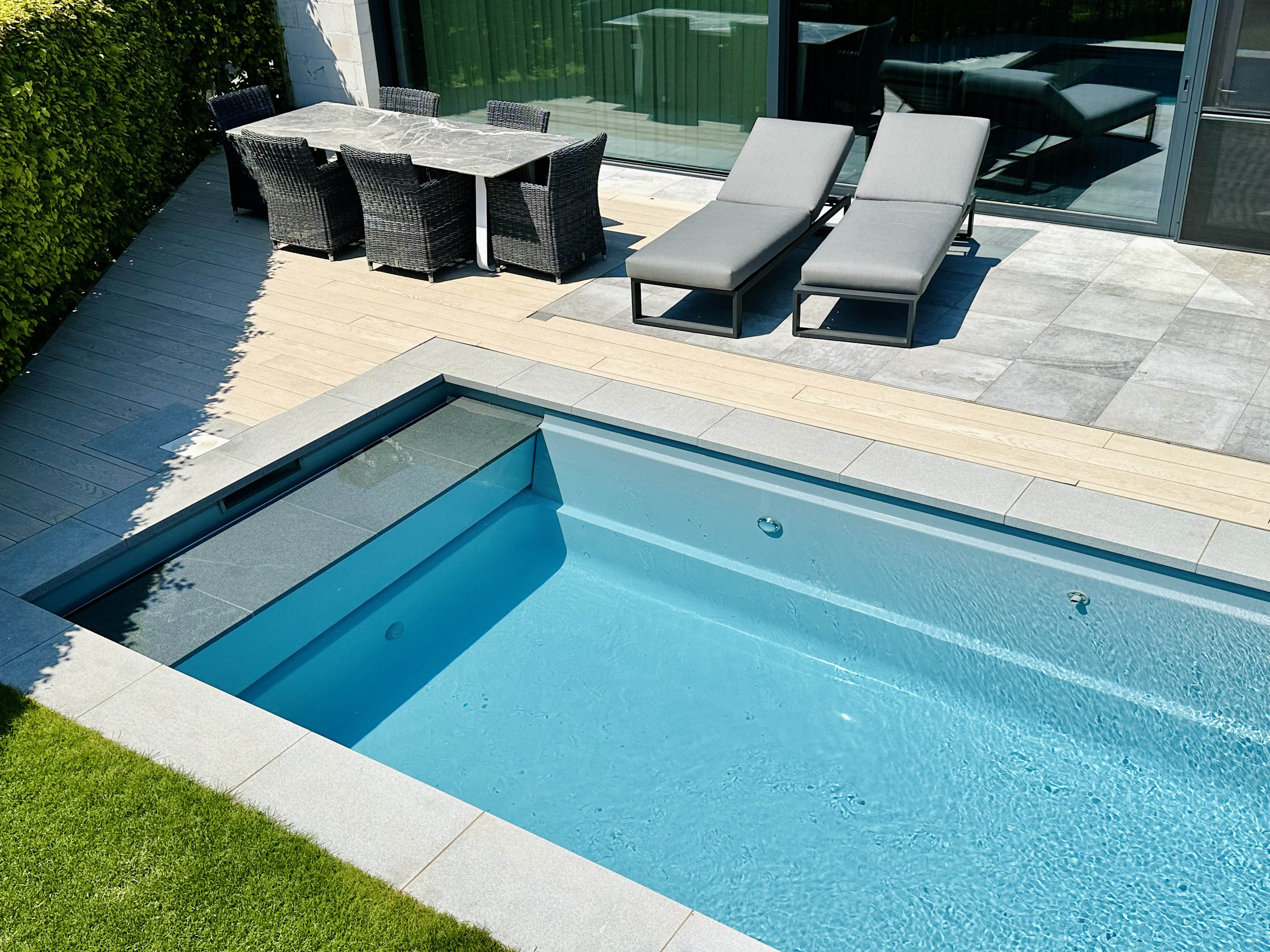 Le mouvement des petites piscines succédera-t-il bientôt à celui des petites maisons ? Cela se pourrait bien, car les jardins sont de plus en plus petits. Mais cela ne signifie pas que vous devez renoncer à vos rêves de piscine. Il suffit de regarder cette piscine, construite avec le modèle La Strada Mini Pool de Leisure Pools. La piscine est compacte mais offre tout le luxe et le confort d'une piscine plus grande : un traitement automatique de l'eau, une plage, des marches intégrées et une couverture T&A de haute qualité. L'option 'Zero Energy' de Leisure Pools permet même de maintenir les coûts énergétiques à un niveau étonnamment bas.