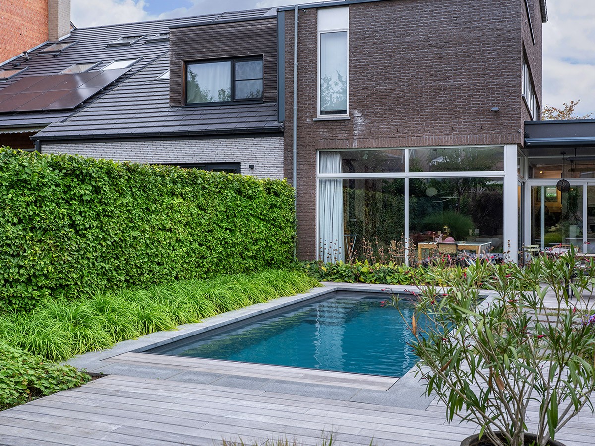 Dans un petit jardin urbain, Tuinwerken Willemsens a créé une oasis de paix où se mêlent eau, végétation et confort. La piscine aux lignes épurées, bordée de dalles en granit, se prolonge dans une bordure végétale foisonnante, riche en couleurs et en textures, qui s'intègre parfaitement à l'environnement. Malgré sa taille compacte, le jardin respire l'espace, la tranquillité et le raffinement. On y perçoit un équilibre subtil entre le luxe contemporain et le charme naturel.