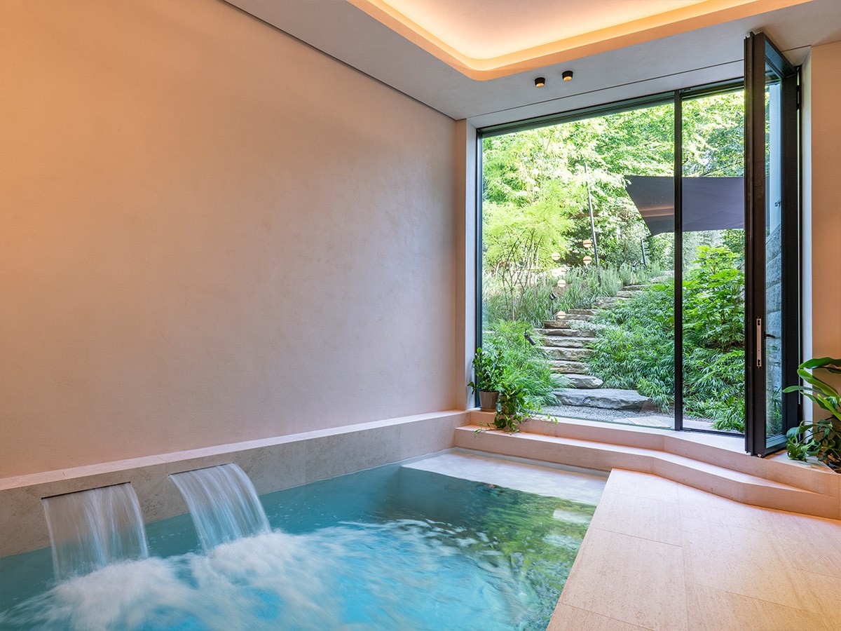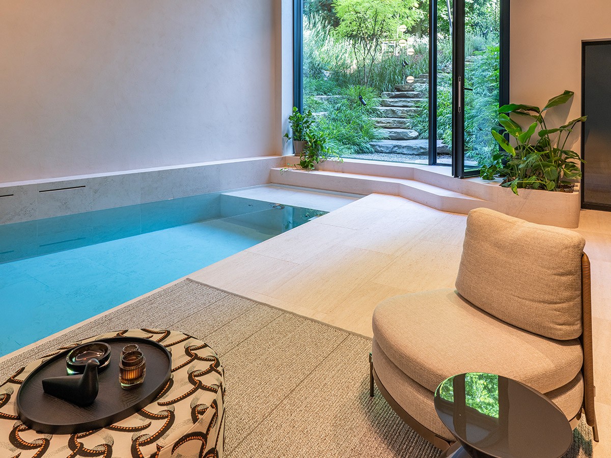 Ce qui n'était au départ qu'une simple réparation s'est transformé en une rénovation complète d'une piscine en sous-sol pour en faire un espace bienêtre lumineux et apaisant. En étroite collaboration entre l'architecte et le paysagiste, le jardin a été creusé et une grande baie vitrée a été installée, permettant à la lumière naturelle de pénétrer profondément dans la pièce. La piscine, finie en travertin et carreaux de céramique, est mise en valeur par deux élégantes cascades et un système de nage à contre-courant. L'atmosphère paisible et l'utilisation de matériaux naturels évoquent une véritable sensation zen. Ce projet se distingue par sa cohérence architecturale, son savoir-faire et sa sérénité.