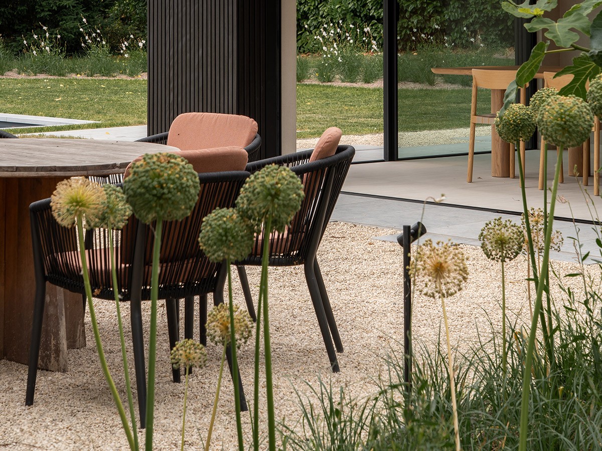 Dans le jardin d'une villa à Waarloos, BoGarden a réalisé un luxueux pool house de style champêtre. Ce projet allie de manière originale nature, design et bien-être. La structure est composée de poutres en chêne, de maçonnerie chaulée et de bois dur teinté en noir, coiffé d’un magnifique toit de chaume qui confère à l'ensemble une apparence chaleureuse et authentique. À l'intérieur, le sauna finlandais et l’hammam offrent une expérience de bienêtre intense. L’élégante décoration intérieure signée Droika Engelen, la douce chaleur du foyer et les matériaux naturels dégagent une atmosphère empreinte de sérénité. Un chef-d'oeuvre de travail artisanal, de confort et de caractère.