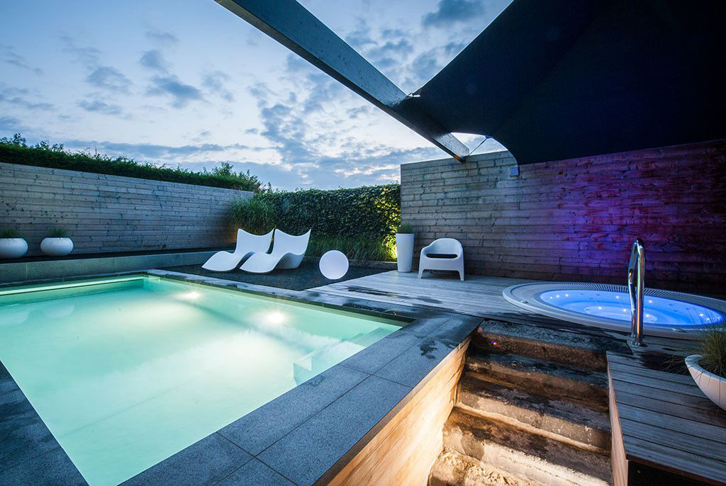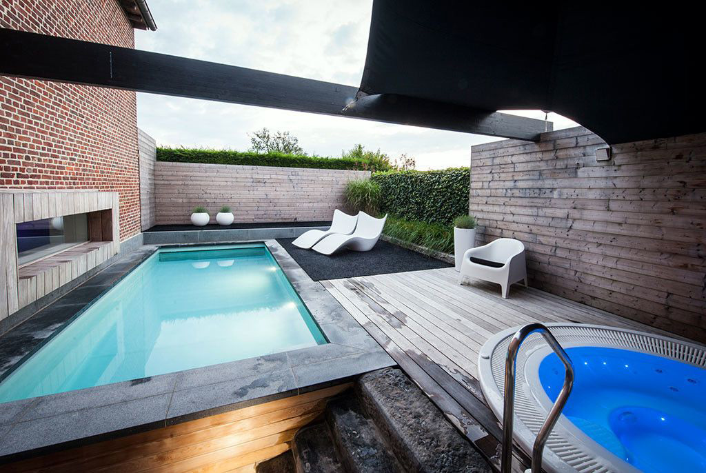 Une piscine et un spa ont été ajoutés à l’espace bien-être aménagé dans cette ferme en carré. La piscine a été équipée d’une membrane gris clair Alkorplan 2000. La bordure est en granit de Chine. La piscine est intégrée dans une construction en bois qui abrite également le spa. Les canalisations du spa ont été aménagées sous cette construction. Le spa est de type Victoria, une cuve ronde séparée avec des points lumineux RGB.
