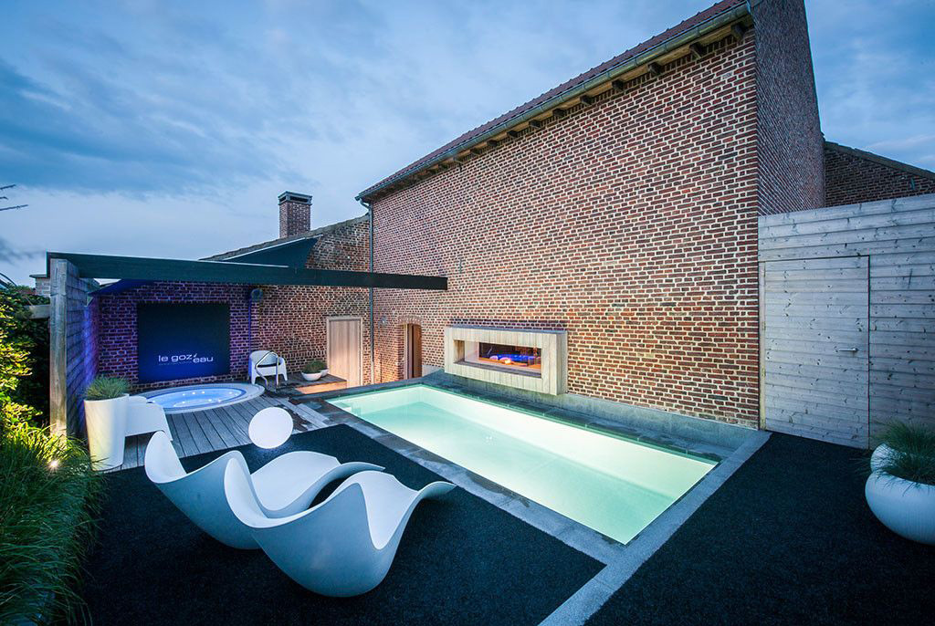 Cette partie de l’espace bien-être est à l’air libre, ce qui explique les couvertures et l’installation des pompes à chaleur pour la piscine et le spa. La sobriété de la vieille ferme et la combinaison piscine et spa à l’extérieur, sauna et hammam à l’intérieur avec la possibilité d’un massage par la maîtresse de maison font de cet espace un lieu de bien-être privilégié.
