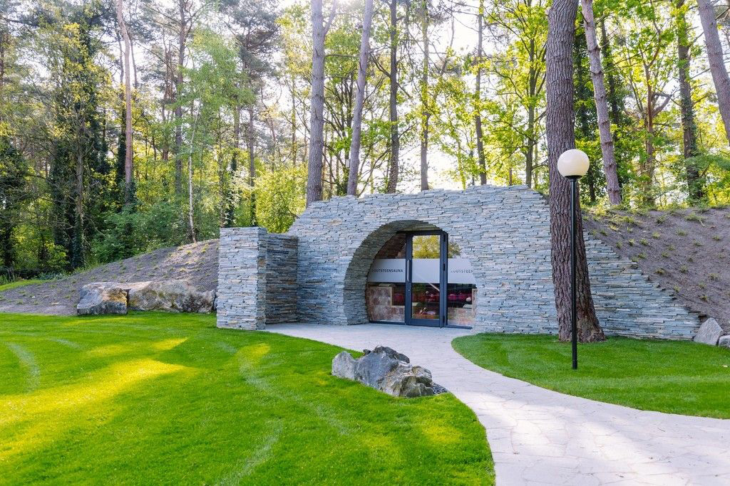 Cette grotte de sel spectaculaire en forme de tuyau, d’une longueur de 9,6 m et un diamètre de 3,5 m, est enterrée dans le sol. La pièce est entièrement revêtue de pierres de sel lisses de l’Himalaya, même autour du gigantesque poêle à gaz (facture d’énergie réduite et temps de chauffe plus court) entièrement automatique. L’ensemble présente une finition très soignée. C’est un sauna pour relaxer en toute intimité. Pour cela, les banquettes longues sont pourvues de coussins en tissu, et la température est limitée à 60 °C, de sorte que l’utilisateur puisse en profiter plus longtemps et privilégier une véritable détente. C’est un sauna idéal pour s’allonger et papoter en toute tranquillité. L’extérieur est parachevé entièrement en pierre de taille, de sorte que le sauna se fond véritablement dans son décor.
