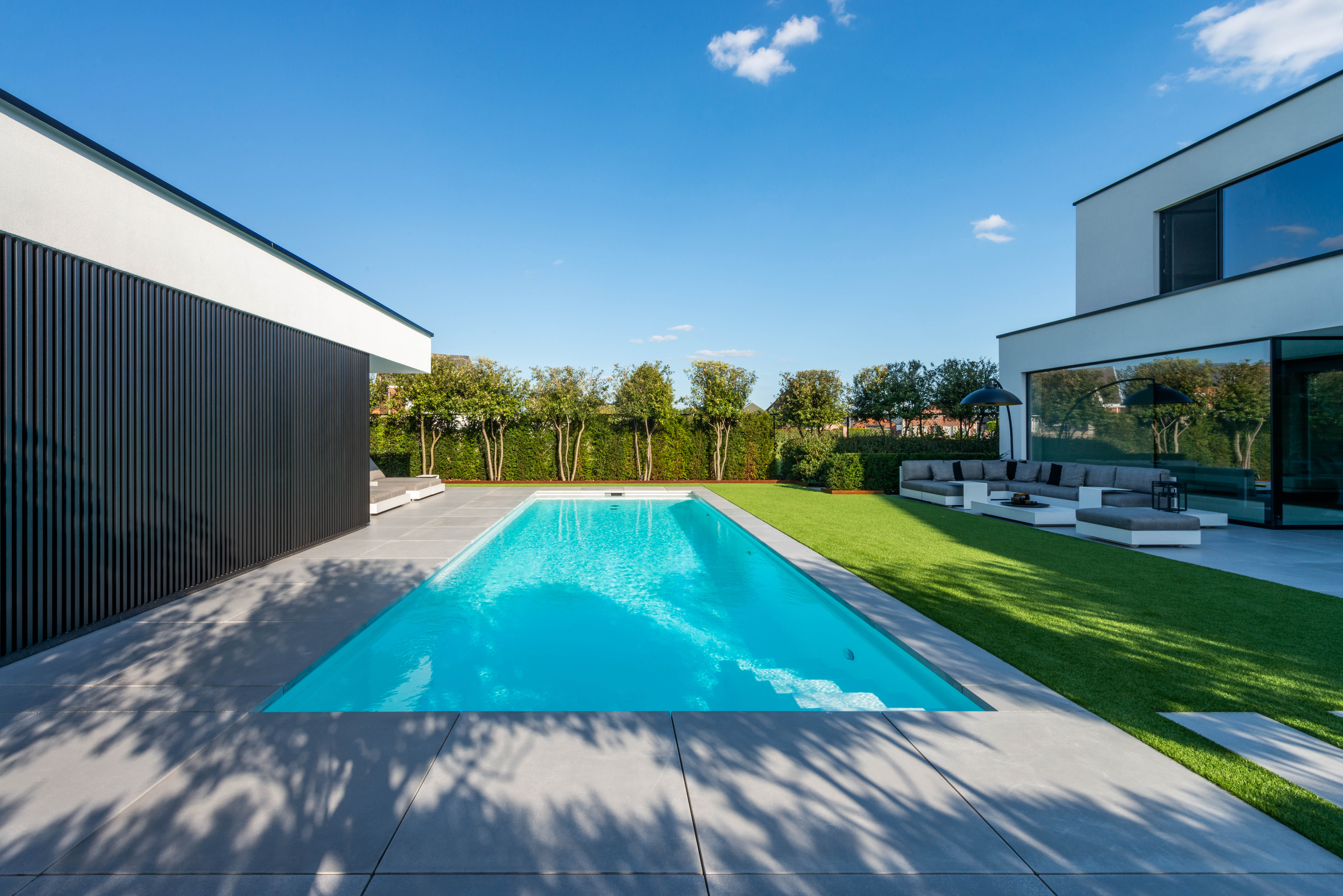 Les propriétaires de cette piscine ont tous les deux des emplois du temps très chargés. Après leur longue journée de travail, ils aiment aussi se prélasser au soleil. Pour leur permettre de profiter pleinement du soleil, la piscine et le coin salon ont été placés très stratégiquement entre la villa et la poolhouse. La piscine devait également s'intégrer harmonieusement au style de la maison. Objectif atteint ! Il s'agit d'un très beau projet, qui forme un ensemble aux finitions parfaites.