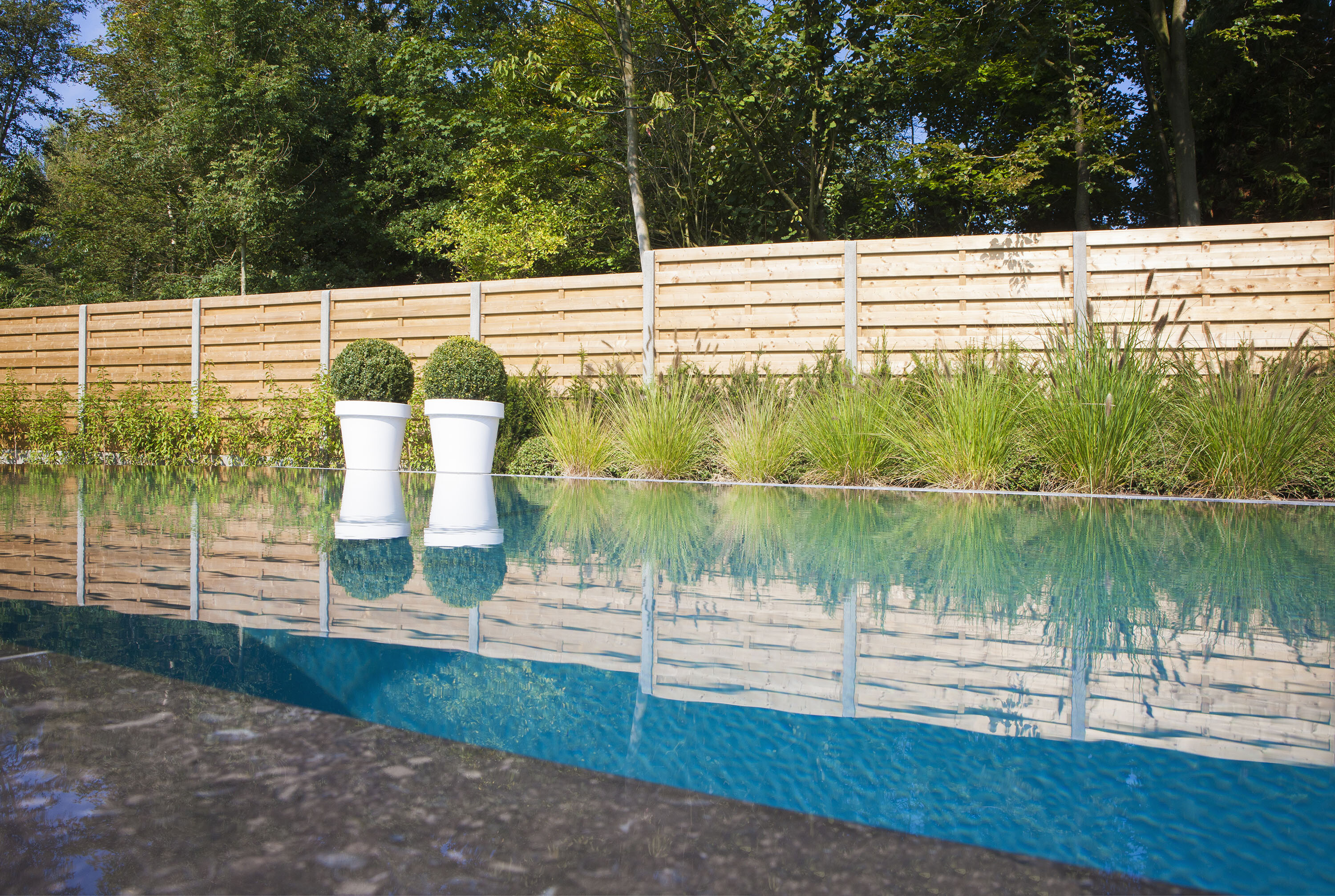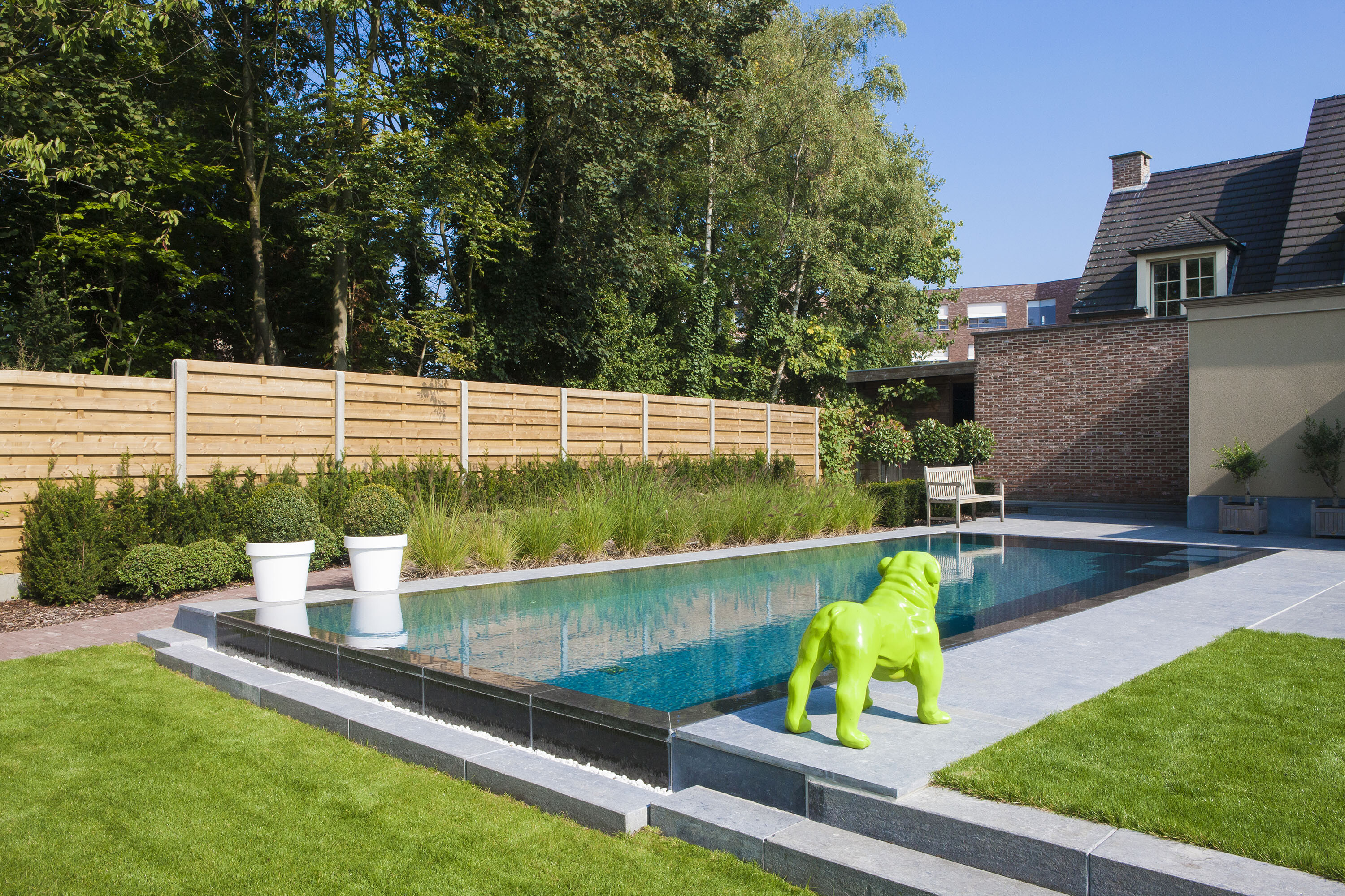 Dans ce projet de rénovation, un bassin classique avec skimmer devait être rénové en une piscine à débordement. Grâce au jardin en pente, la piscine située à l’arrière semble sortir de terre, ce qui donne un très bel effet d’infini. Ce projet a été récompensé par l’or au concours du ‘Constructeur belge de Piscines, de Wellness et d’Etangs de natation 2017/18’ dans la catégorie rénovation.