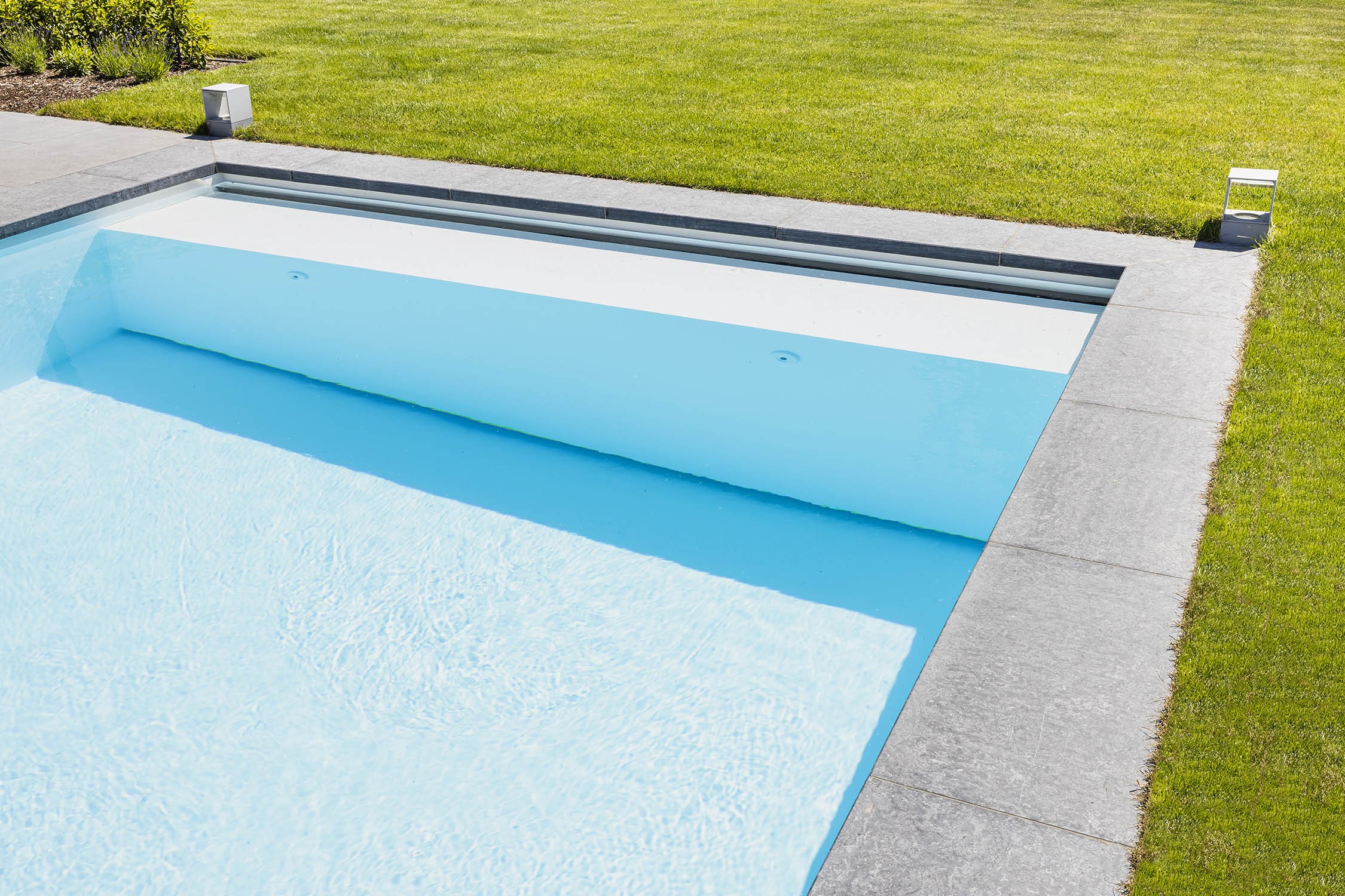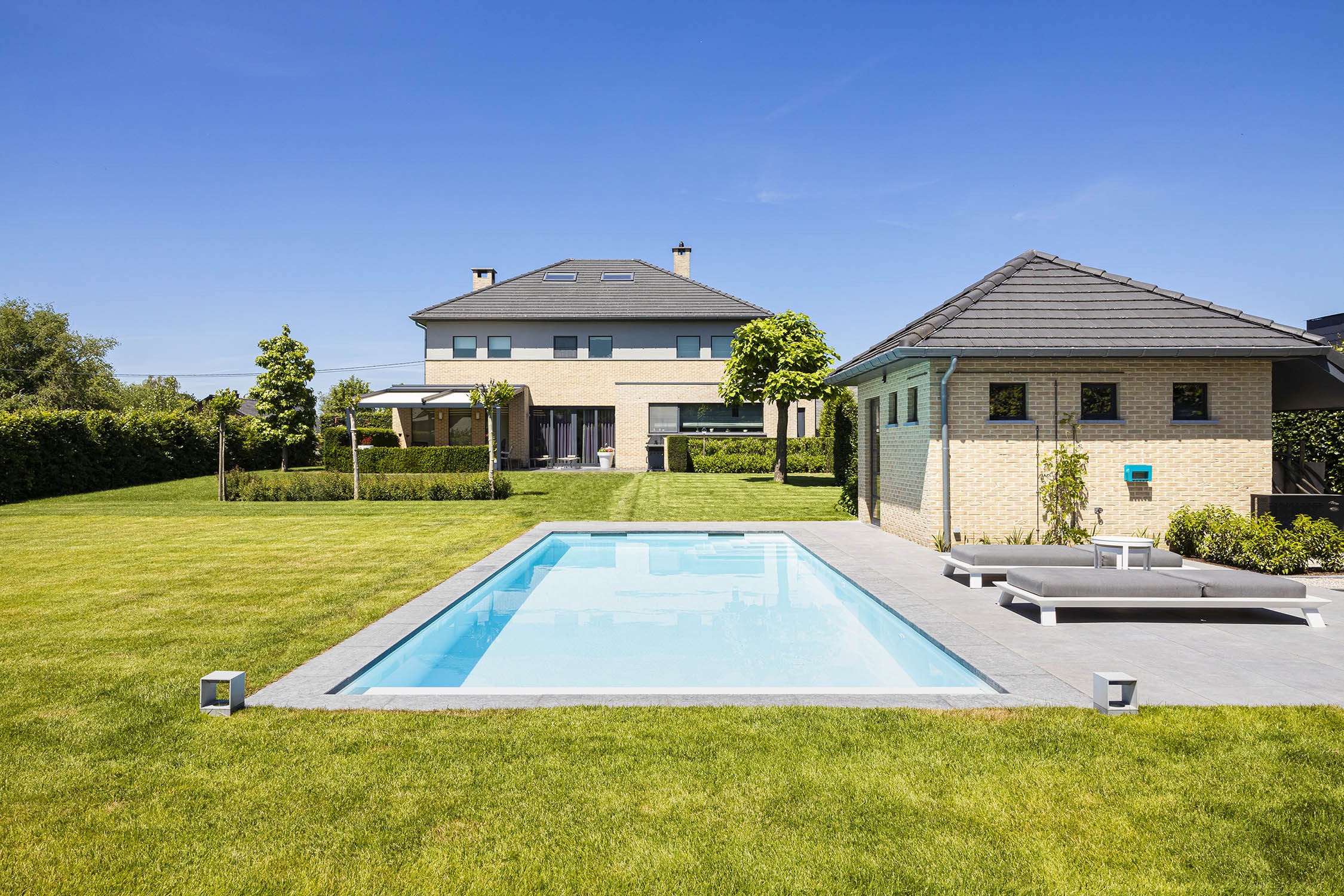 Cette piscine blanche à skimmer est fabriquée sur mesure en PPC, un plastique solide et sûr, résistant aux bactéries et aux rayures. Outre les avantages techniques du PPC, la cuve blanche est également un atout en termes de design. La couleur blanche fait resplendir la piscine et lui confère une ambiance conviviale et moderne. Et si vous la placiez dans votre jardin ?