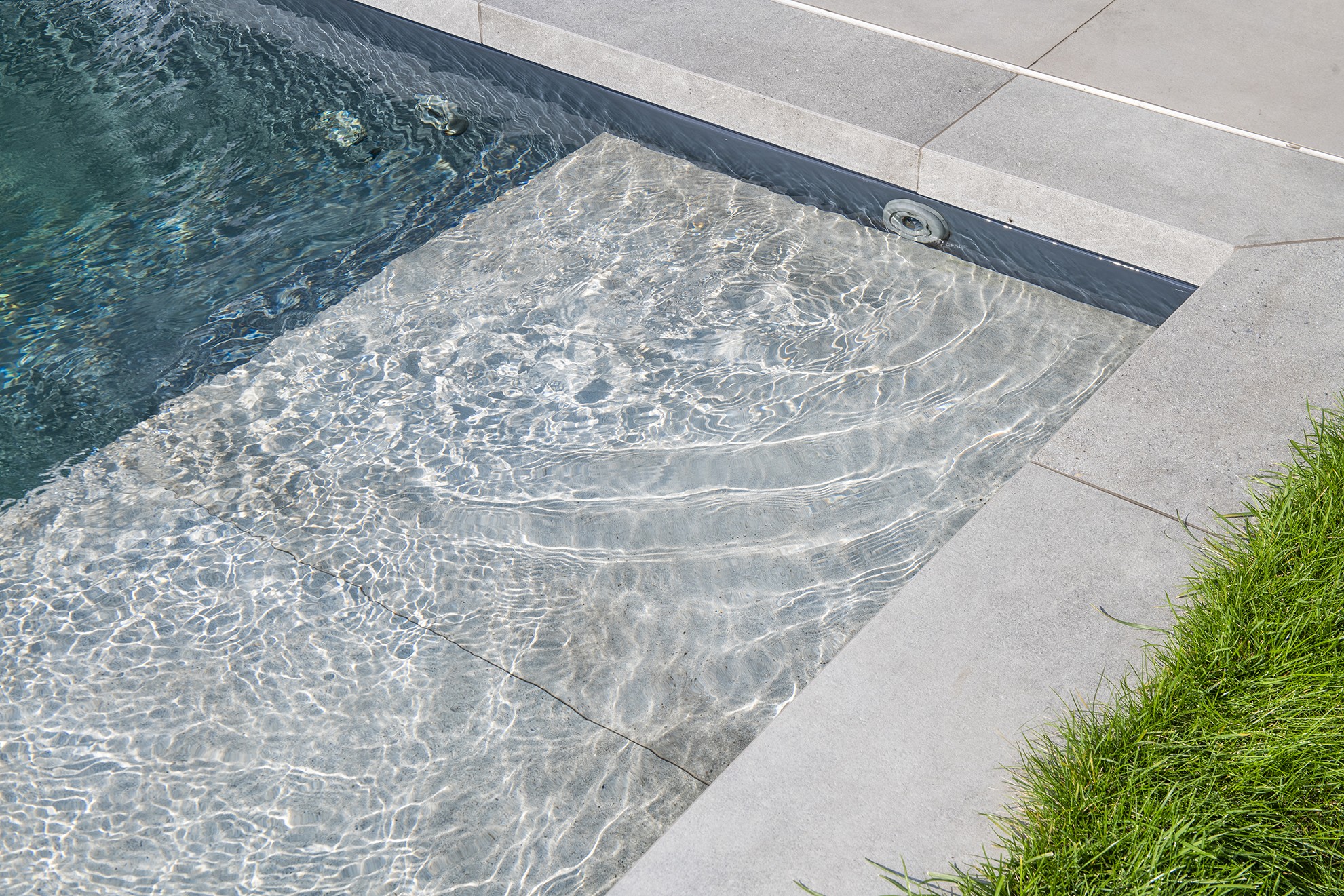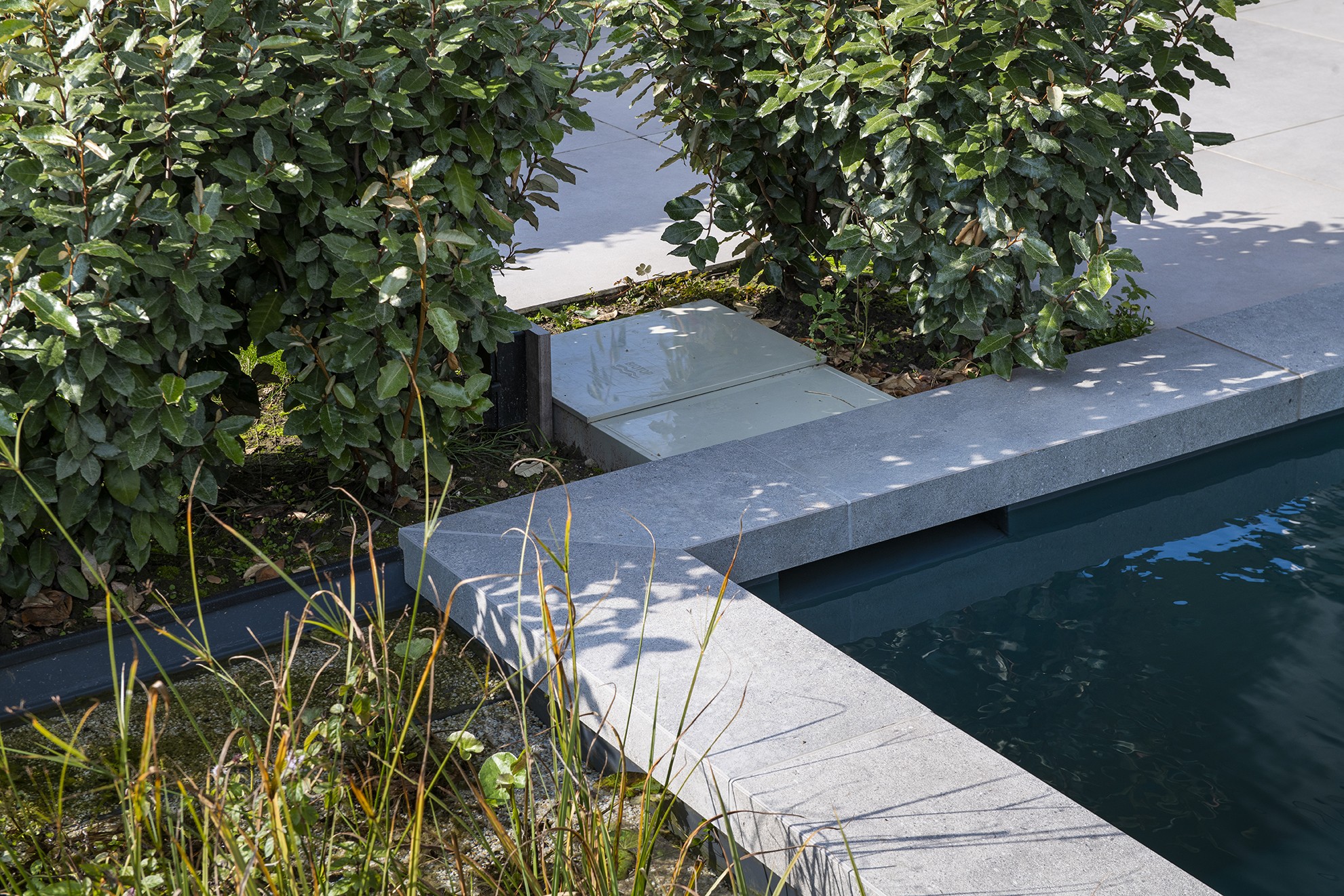 Un étang de natation dans le style d’une piscine moderne ? Pour y parvenir, placez le plan d’eau juste à côté de la maison de telle sorte que vous puissiez toujours apercevoir l’eau. Choisissez les mêmes dalles en céramique pour la margelle que pour la terrasse contiguë. Dissimulez habilement le volet roulant sous la plage. Mission exécutée à merveille par Geoblauw.