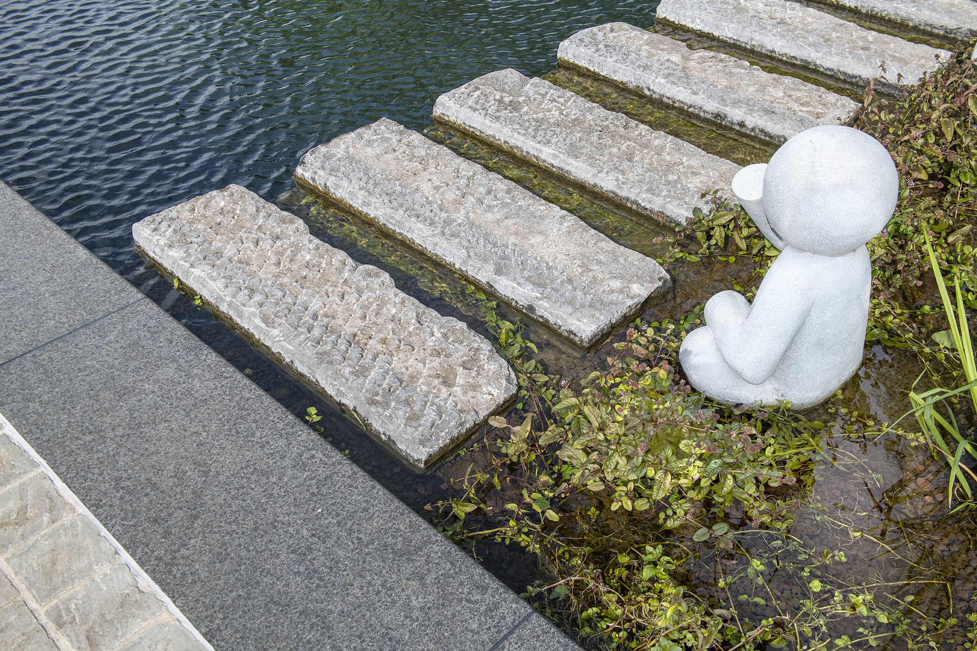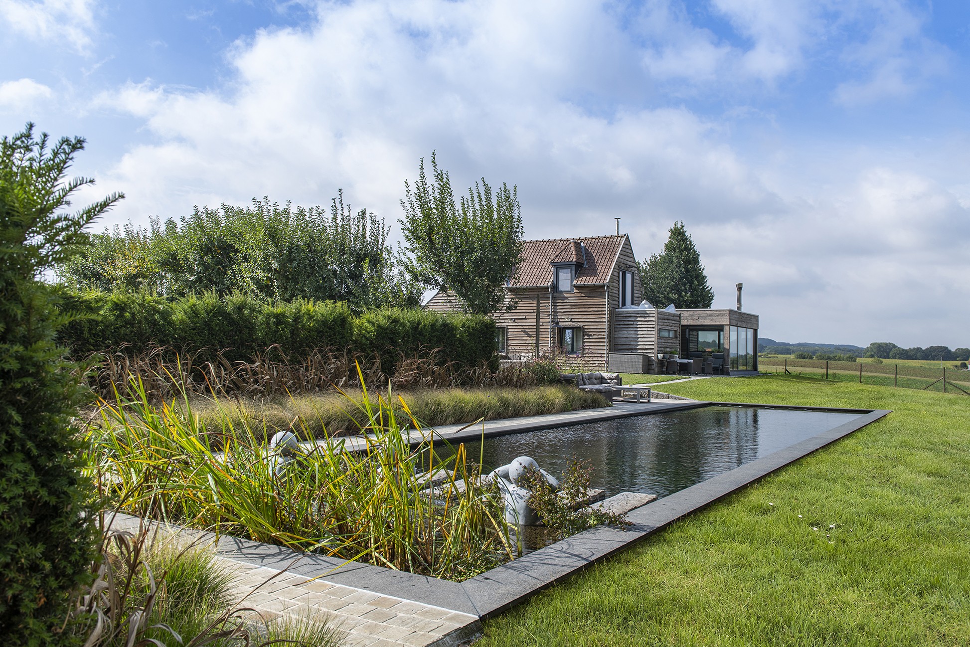 Entendre, voir et se taire. Les trois statues de la zone végétale révèlent immédiatement l’objectif de cet étang de natation : profiter en silence de tous les bienfaits de l’eau. Les magnifiques vues sur le paysage vallonné donnent l’illusion de se trouver dans la douce France. Un projet astucieux réalisé par Biopools Degroote Koen.