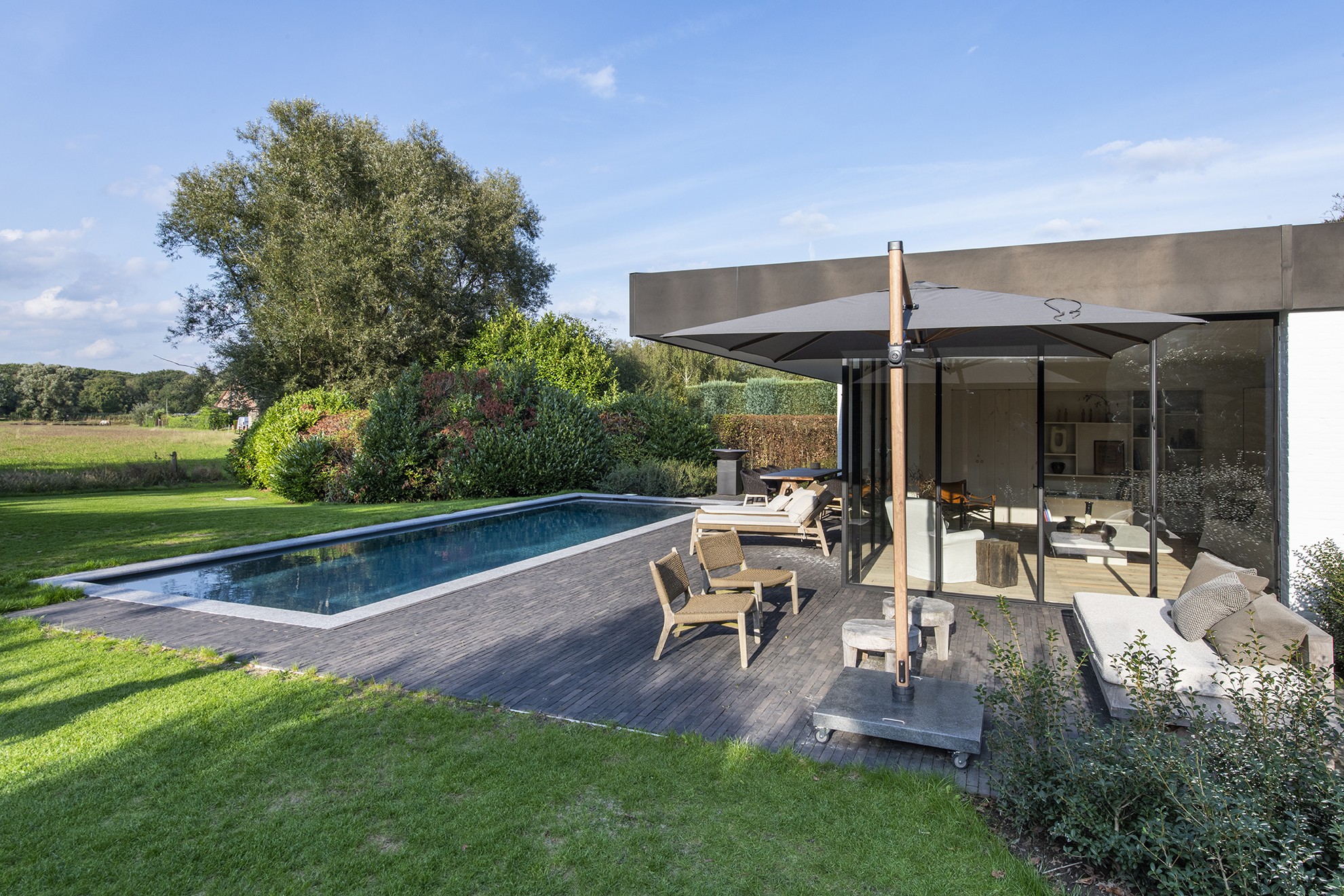La villa imposante associe parfaitement un toit de chaume avec une extension moderne. De même, le constructeur de la piscine associe dans ce projet des éléments de design classiques et contemporains. Le choix de la pierre bleue d’Irlande en tant que matériau pour la margelle à nez arrondi constitue un élément typique de design traditionnel. Le liner foncé et les skimmers à grande meurtrière sont cependant totalement tendance. Bravo !